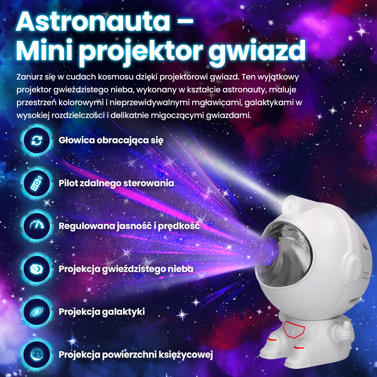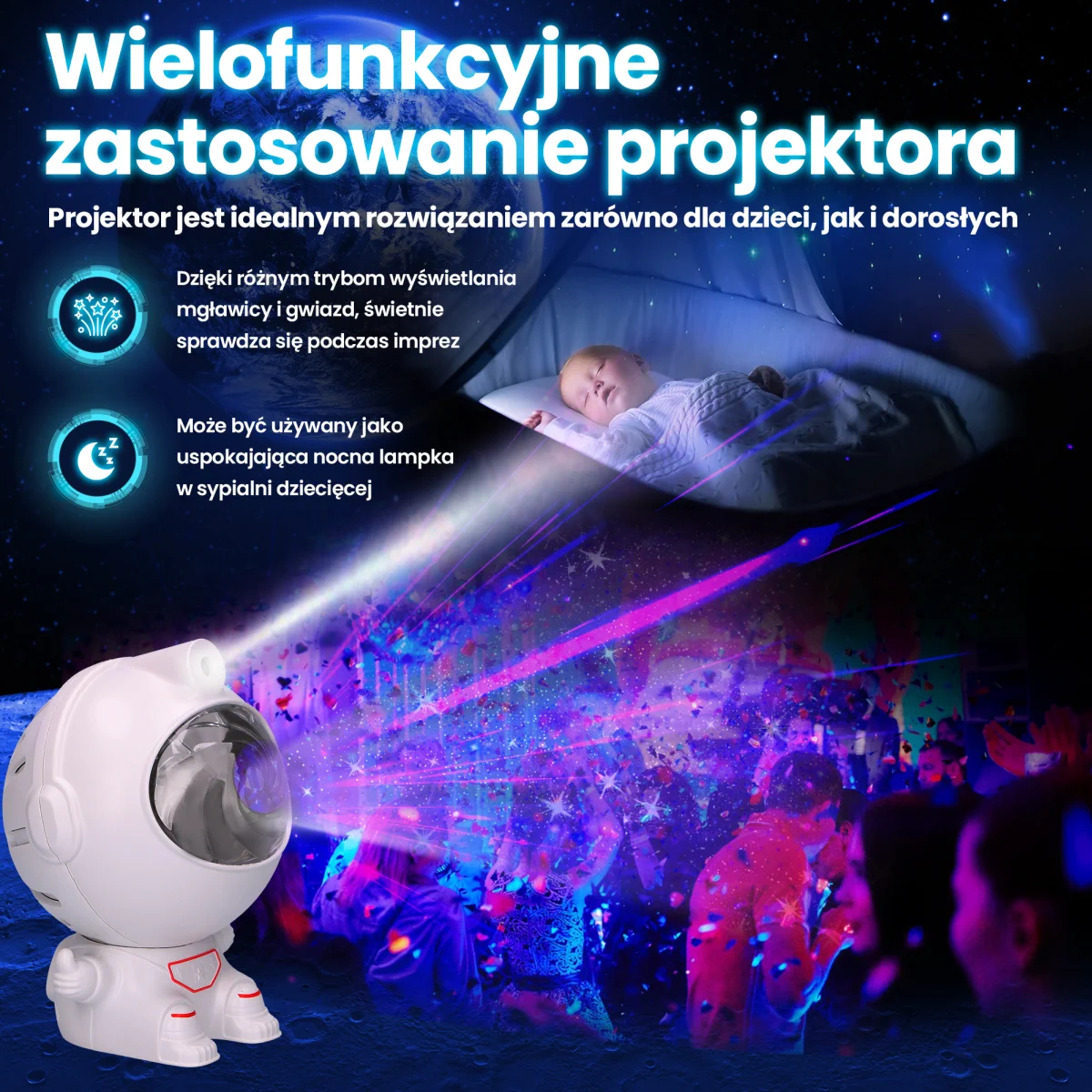 Projektor Galaxy - to je nejen skvělý doplněk do každého prostoru, ale také promyšlený dárek. Díky své schopnosti podněcovat zvídavost, představivost a kreativitu je zvláště atraktivní pro děti. Je ideální pro vytvoření krásné noční atmosféry pro vaše děti, pro strávení romantického a pohodového večera s vaší milovanou osobou nebo jen pro relaxaci po dlouhém dni. Tento projektor je dokonalým svátečním dárkem pro milovníky, děti, rodinu a přátele, zachycuje krásu noční oblohy v rozkošné astronautské podobě.