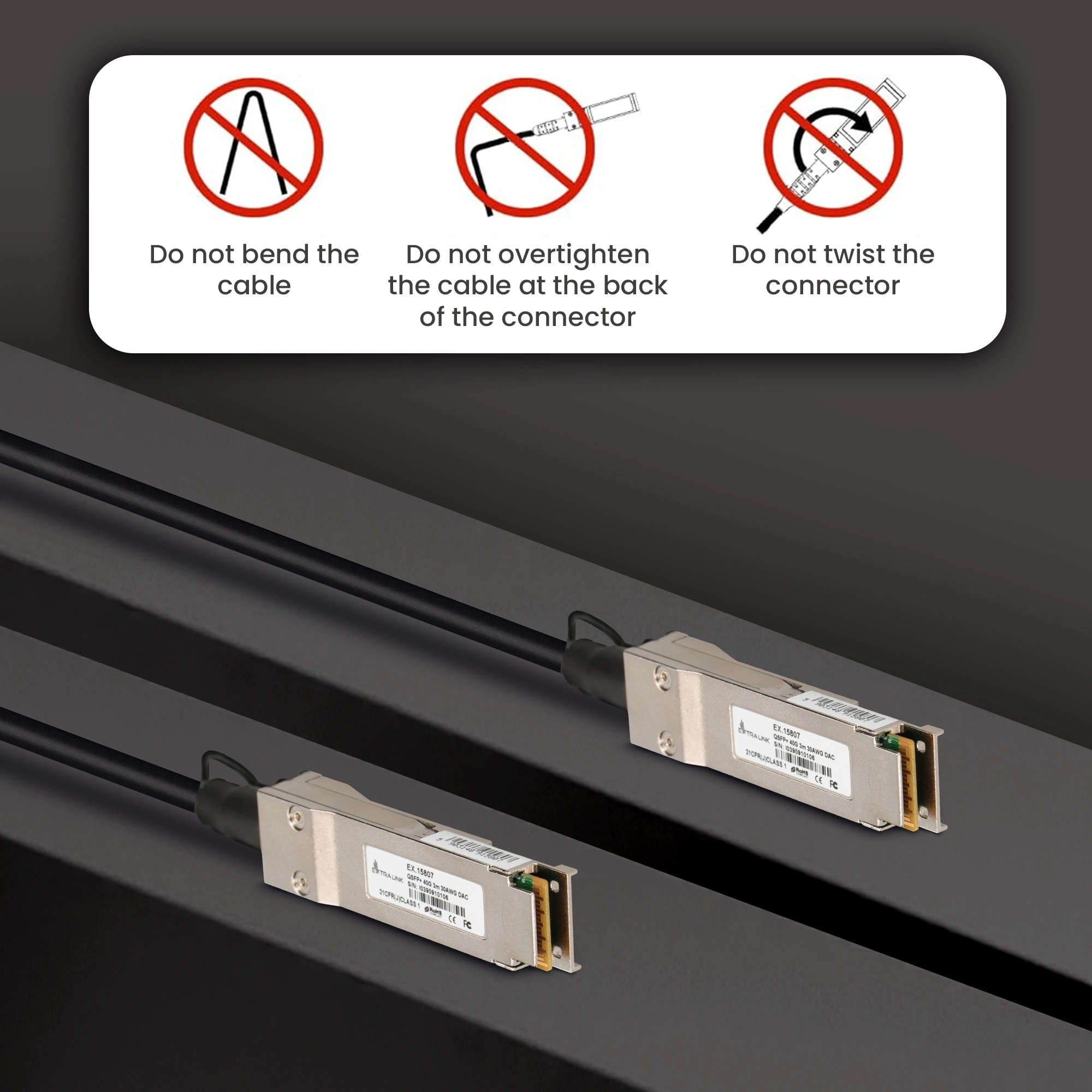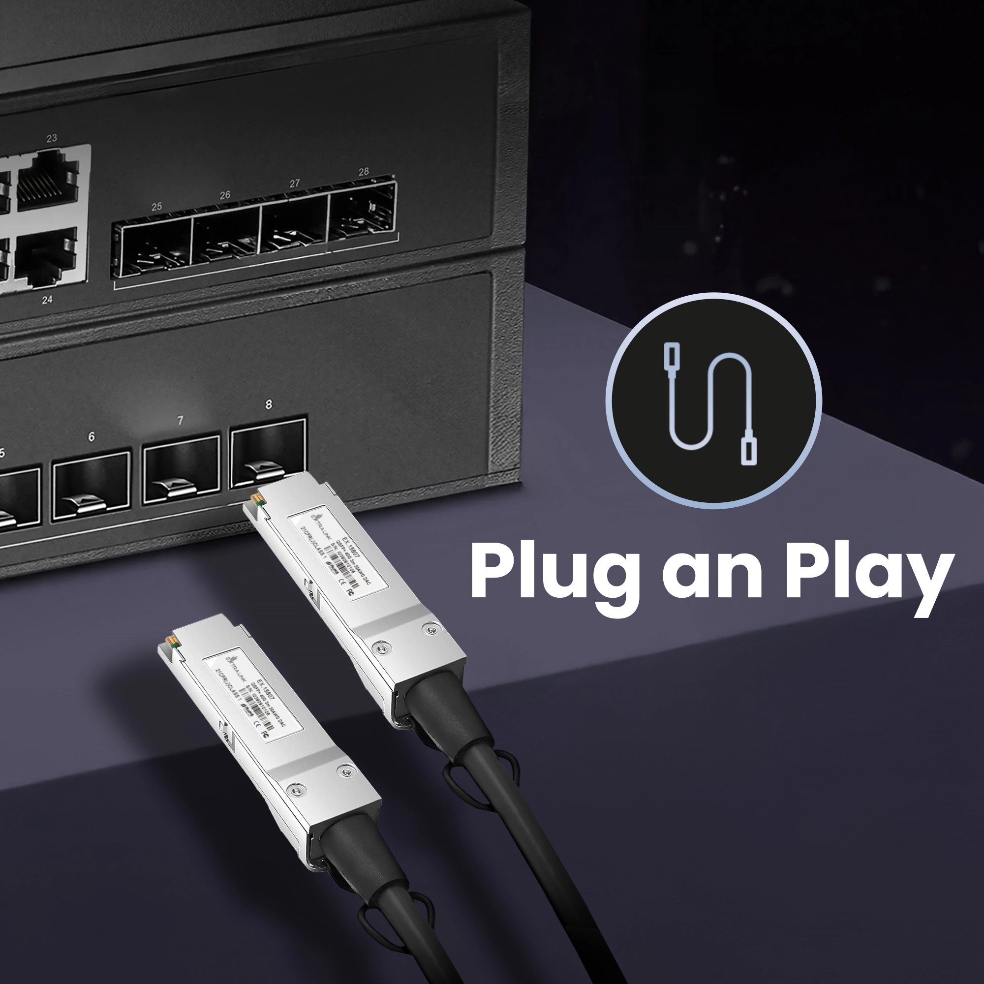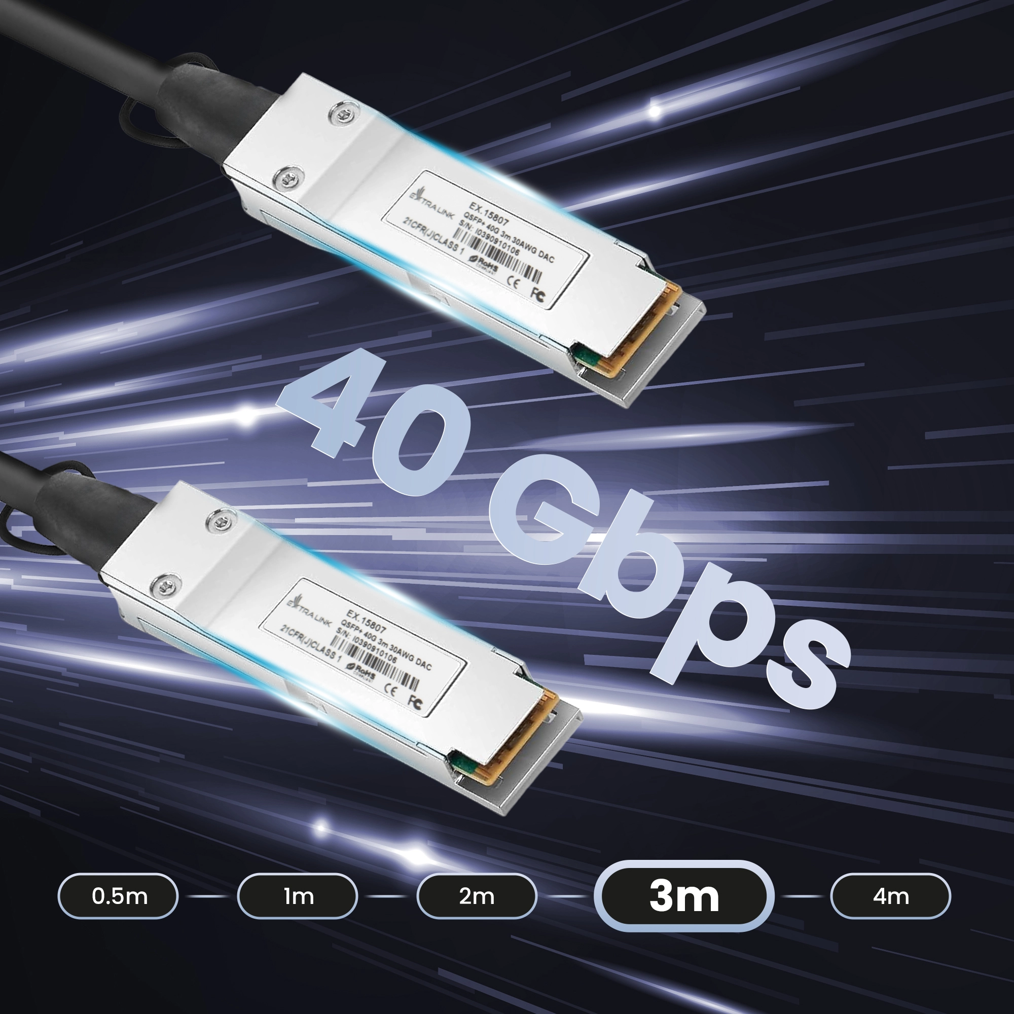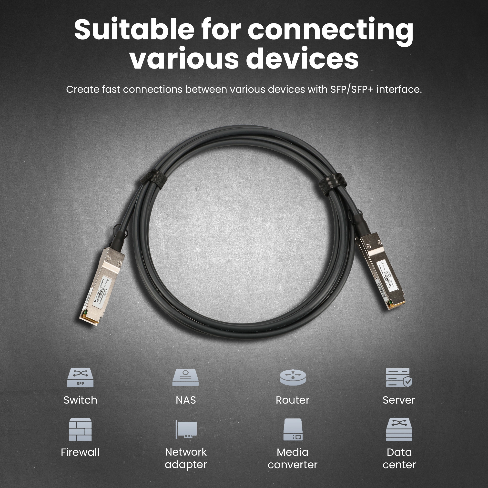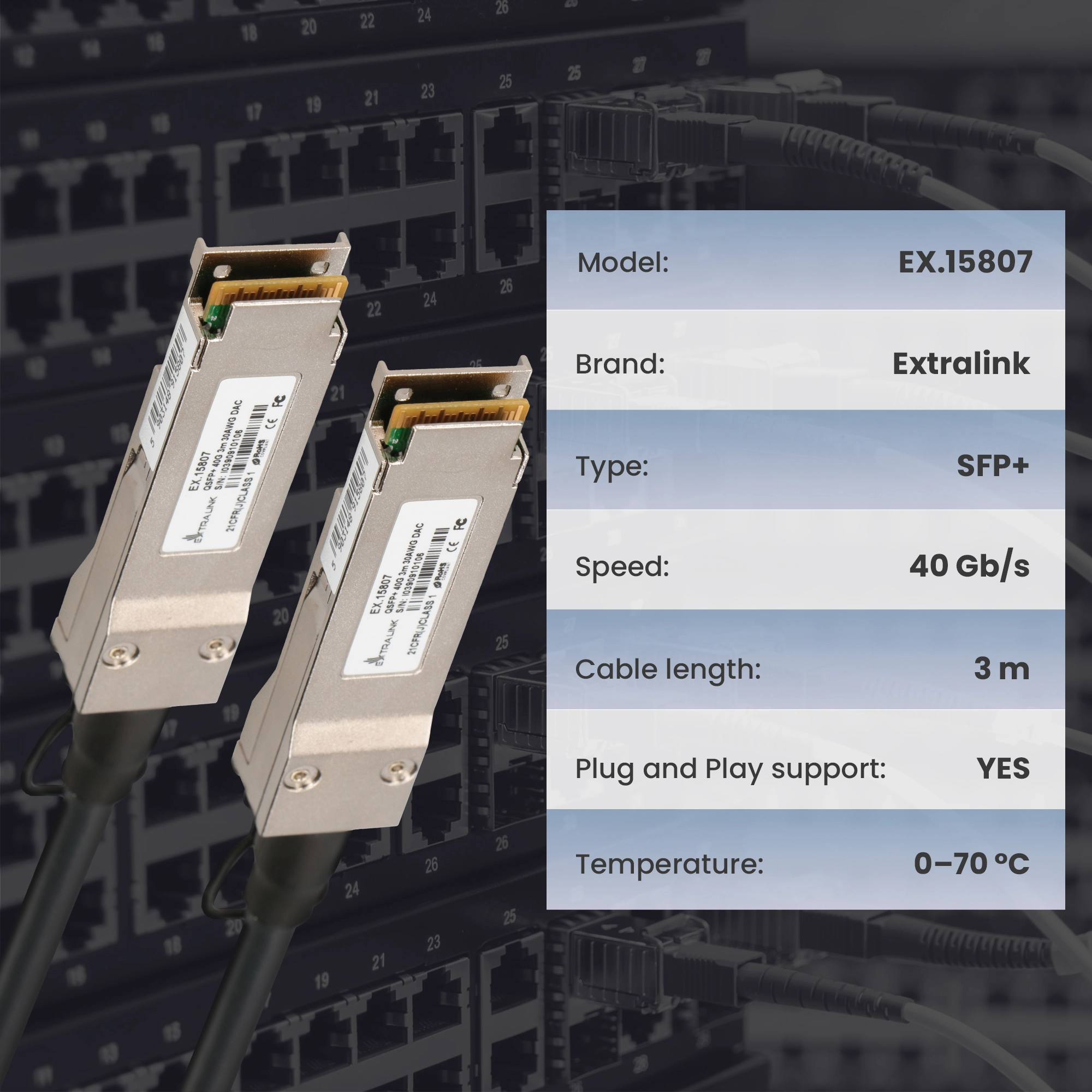 Kabel QSFP + DAC lze použít k vytvoření vysokorychlostního sériového datového spojení mezi dvěma síťovými zařízeními. Tento kabel je vybaven dvěma 40Gbps QSFP + konektory. Nízká spotřeba a cena činí toto řešení velmi atraktivním zejména pro spojení na krátké vzdálenosti. Extralink QSFP + DAC nabízí přenosovou rychlost 40Gbps na vzdálenost 3m.