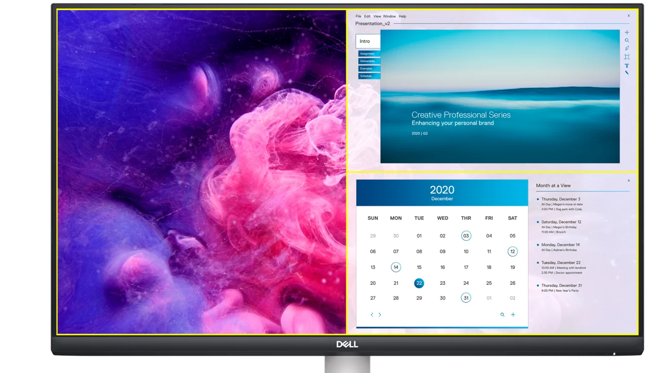 Der Dell S2721D Monitor ist ein hochmodernes Gerät, das über zwei HDMI-Anschlüsse verfügt, um verschiedene Geräte einfach anschließen zu können. Die Dell EasyArrange-Funktion hilft Ihnen, Ihre Anwendungen, E-Mails und Fenster auf einem Bildschirm zu organisieren. Das macht Ihre Arbeit effizienter und organisierter.