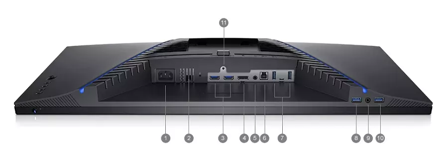 Stromanschluss | 2. Steckplatz für Sicherheitsschloss | 3. 2 HDMI 2.0-Anschlüsse | 4. DP 1.4-Anschluss | 5. Line-Audio-Ausgang | 6. USB 3.0-Anschluss zum Hochladen | 7. 2 USB 3.0-Anschlüsse zum Empfangen | 8. USB 3.0-Anschluss zum Empfangen | 9. Kopfhörerausgang | 10. USB 3.0-Anschluss zum Empfangen | 11. Basisschloss
