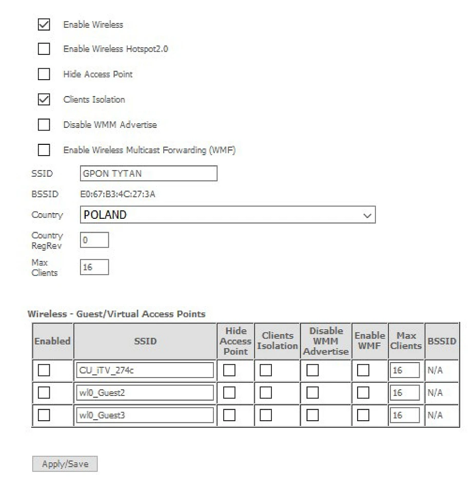 Los ajustes de la Wi-Fi están configurados de la siguiente manera: Polonia, Canal 7, ancho de banda de 20MHz, se ha habilitado el modo de encriptación y aislamiento WPA2 para los clientes conectados: