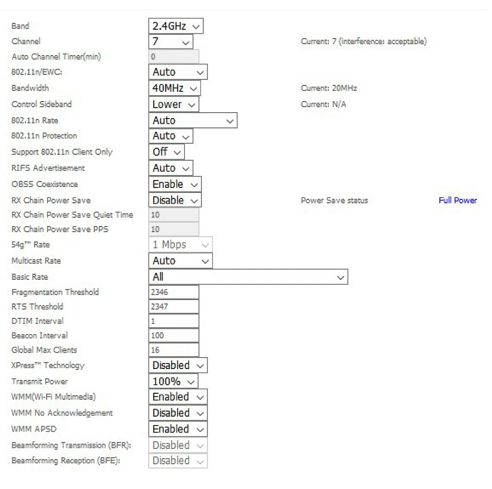 WPS y la red de invitados han sido desactivados, otros parámetros siguen siendo los predeterminados.