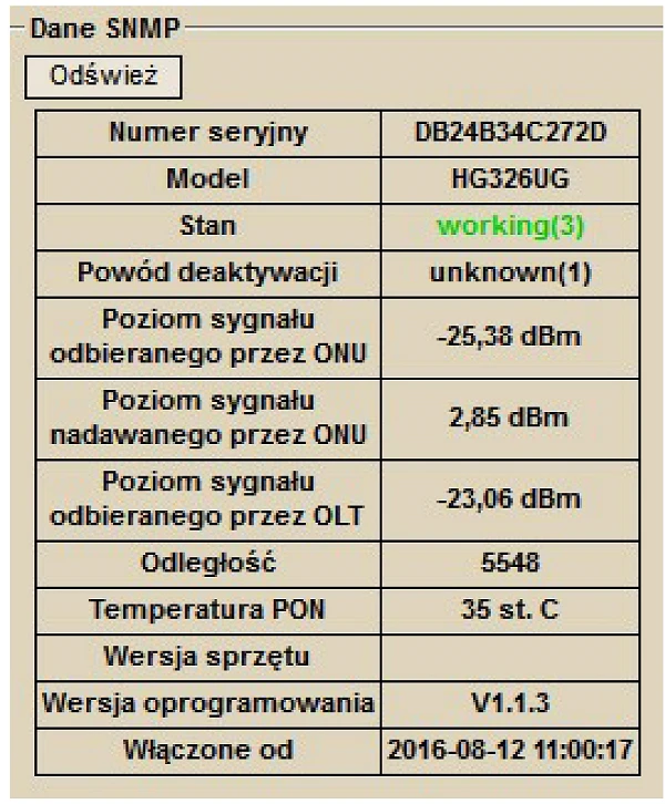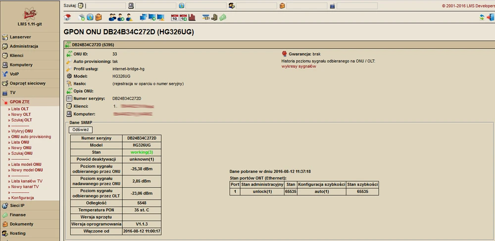 Después de añadir el dispositivo, LMS, gracias al protocolo SNMP, nos permite acceder a datos detallados relacionados con los parámetros de conexión como "Nivel de señal recibido por la ONU", "Nivel de señal recibido por la OLT", "Distancia" o "Temperatura PON" etc.