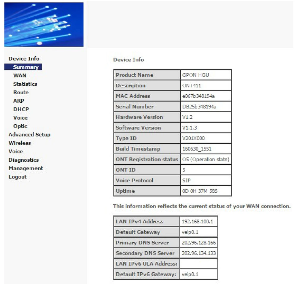 El registro de la ONU fluye de forma muy conveniente e intuitiva a través del LMS y directamente desde el OLT. En el terminal de cliente EXTRALINK TYTAN después de la correcta configuración de la interfaz WAN podemos ver la siguiente información: