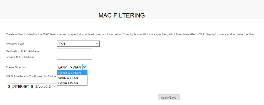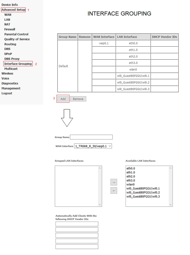 La única cosa que requiere atención es la opción "Port Binding" aquí llamada "Interface Grouping".