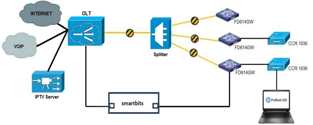 El pasaje fue comprobado usando dos Extralink TITAN GPON/4GE/2POTS/WIFI, dos Mikrotik RouterBoard CCR1036-12G-4S-RM y OLTa ZTE C300.