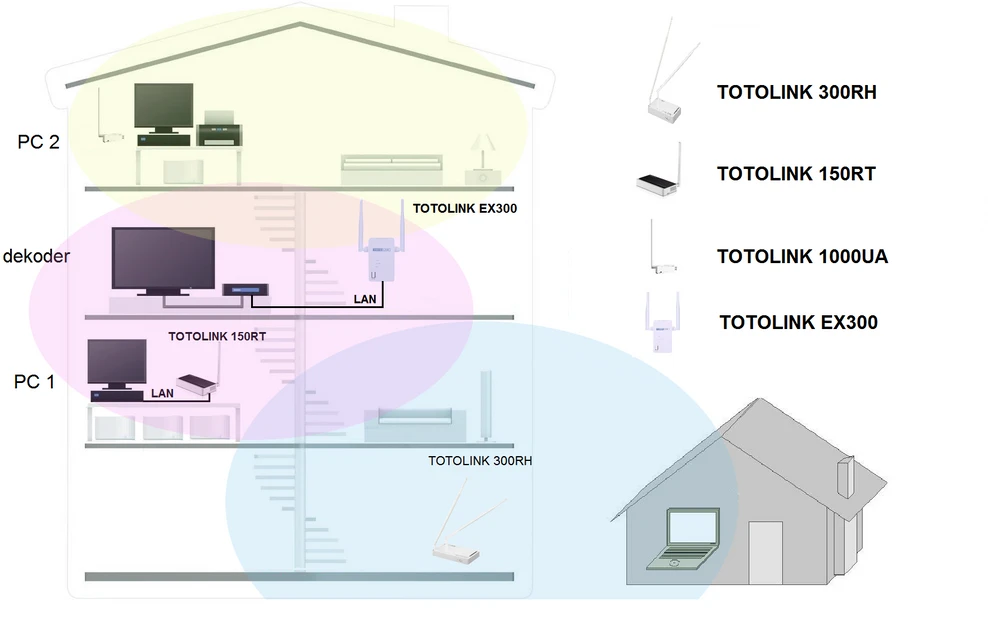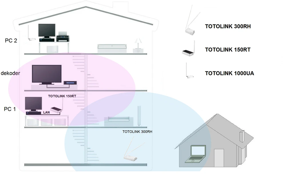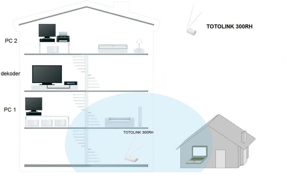 Como pueden ver en la foto, tenemos un router TOTOLINK 300RH para que también cubra los dispositivos móviles ubicados en un pequeño anexo cerca de la casa. Desafortunadamente, otros dispositivos como el PC1, PC2 y el decodificador de los pisos superiores no tienen acceso a la red inalámbrica.