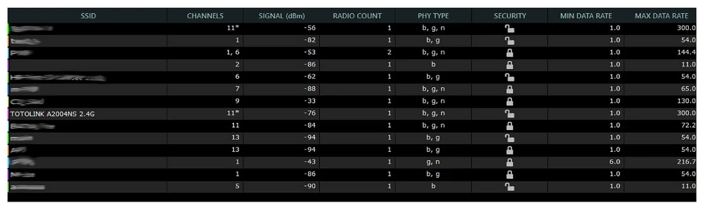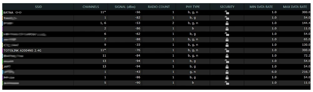 Tenemos a nuestra disposición una red inalámbrica creada en TOTOLINK A2004NS con SSID "TOTOLINK 2004NS 2.4G", y como podemos ver, la fuerza de la señal de esta red es de -76dBm - que es una señal relativamente débil.
