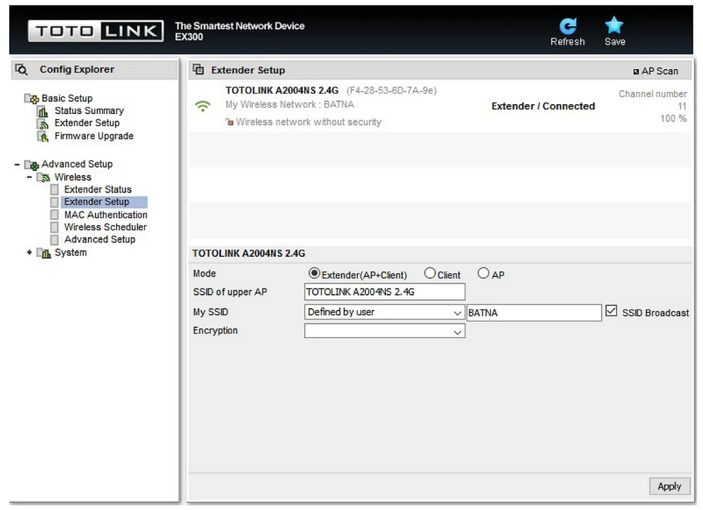 Como podemos ver, usamos el modo Extender (Ap+Cliente), pero con la opción "Mi SSID definido por el usuario" - extendiendo así la red TOTOLINK A2004NS 2.4G, generando un nuevo SSID "BATNA".