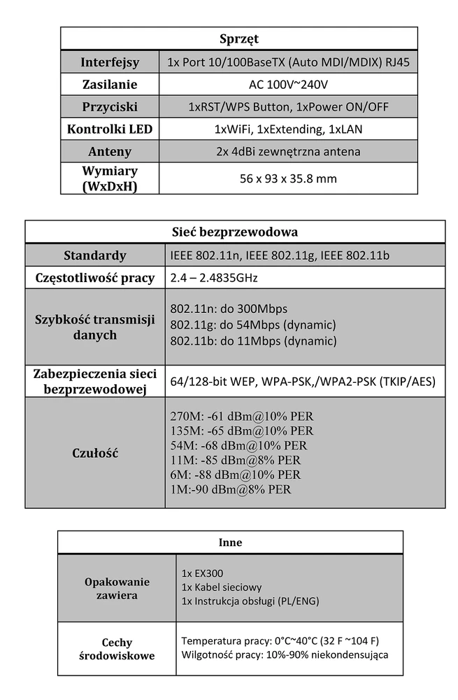 Extender TOTOLINK EX300 es un dispositivo de tamaño similar a una fuente de alimentación externa conectada directamente a una toma de corriente. Debajo hay un puerto LAN Ethernet de 100Mbps, pero las funciones más interesantes están ocultas en el frente - LEDs muy estéticamente iluminados, que informan sobre la actividad del puerto Ethernet, el encendido y la red WiFi activa. También hay un botón WPS.