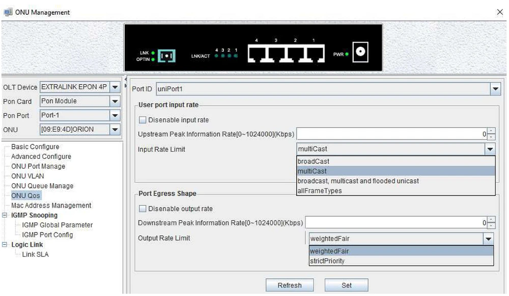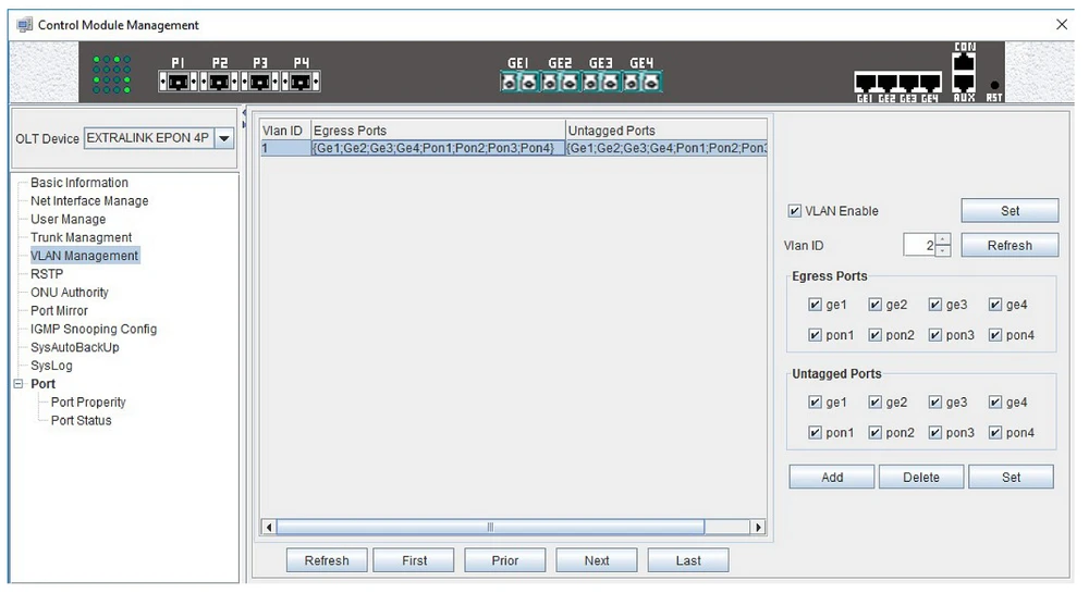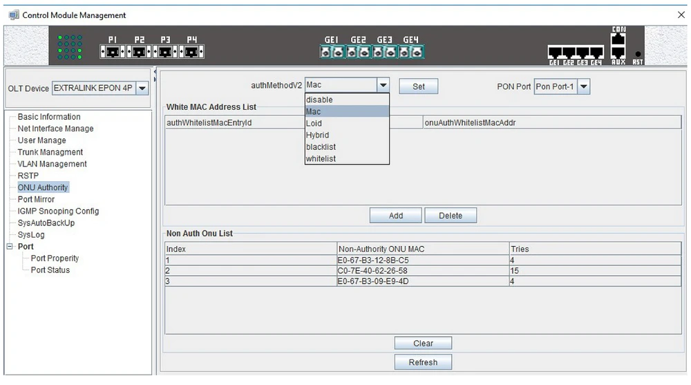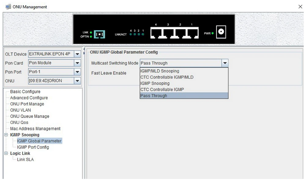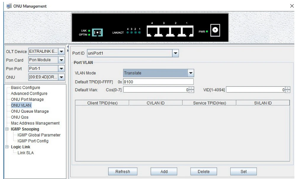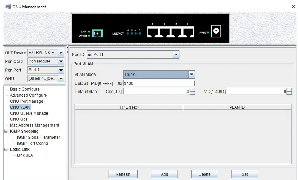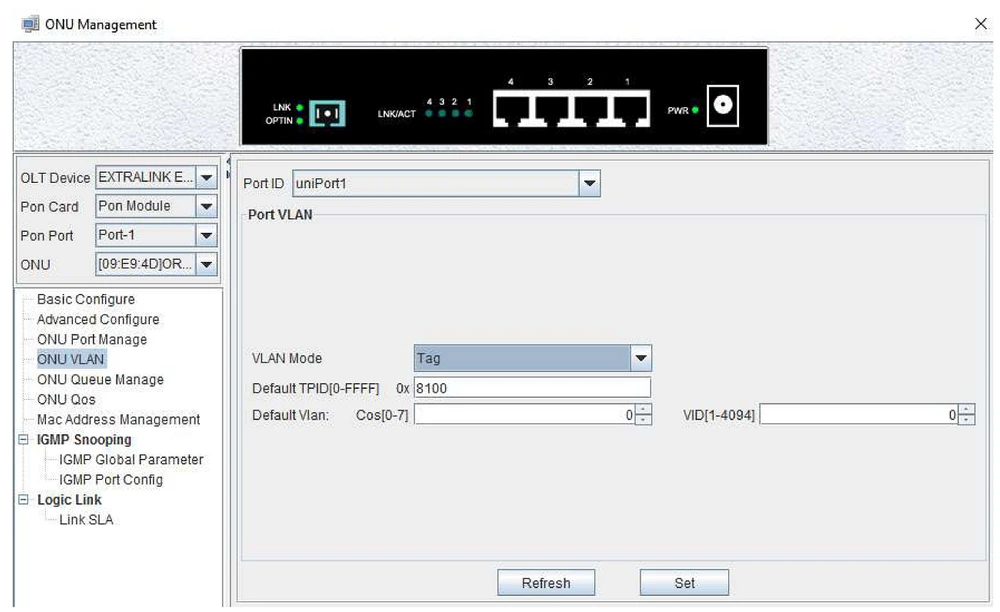 El administrador puede monitorear el estado de los puertos de los dispositivos, configurar VLANs, IGMP, QoS, autenticar y administrar ONU.