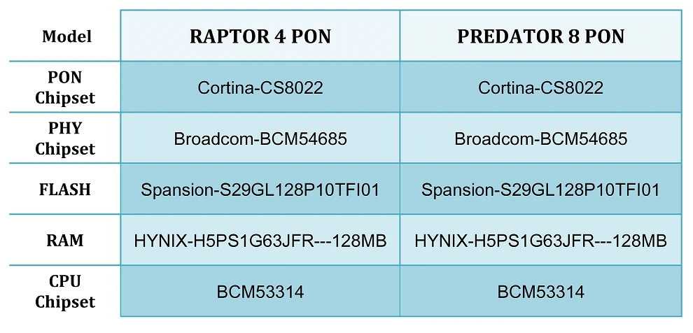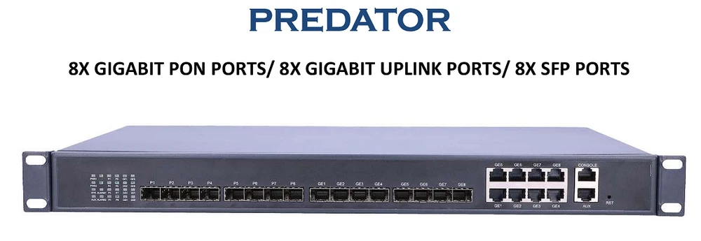 RAPTOR 4X GIGABIT PON PORTS/4X GIGABIT UPLINK PORTS/4X SFP PORTS puede obtenerse dentro de 560USD, mientras que PREDATOR 8X GIGABIT PON PORTS/ 8X GIGABIT UPLINK PORTS/ 8X SFP PORTS dentro de 800USD - y las propinas del cliente para ellos cuestan alrededor de 20USD...