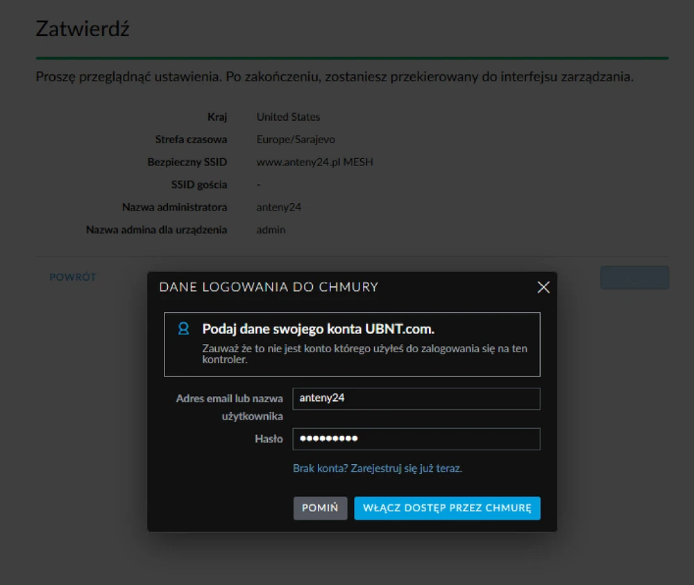 Al final, se nos pedirá que introduzcamos el nombre de usuario y la contraseña de nuestra cuenta en Ubiquiti para poder gestionar todo a través de la nube, pero también podemos saltarnos este paso.