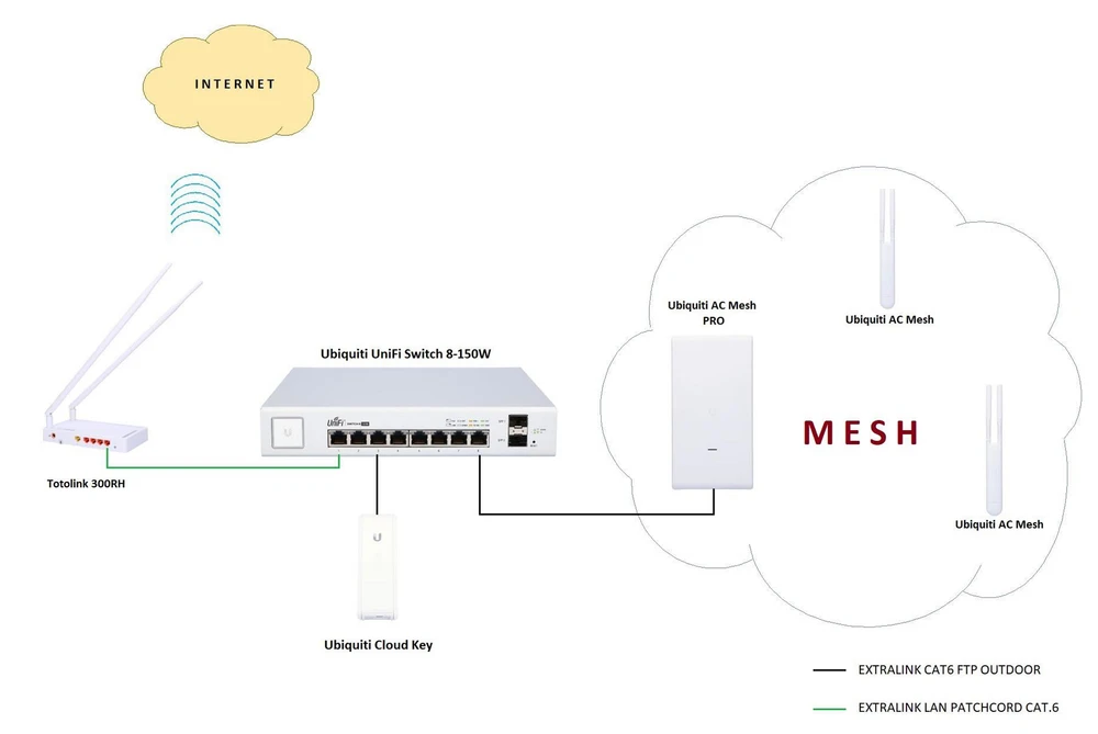 .En esta guía nos centraremos en la configuración de los dispositivos de la serie Ubiquiti UAP AC MESH como una de las mejores soluciones AP disponibles en el mercado. Además, usaremos el controlador Unifi CloudKey, que simplifica significativamente el proceso de configuración en sí mismo y Ubiquiti UniFiSwitch 8-150W, que servirá como la unidad principal de suministro de energía para nuestros dispositivos y actuará como un interruptor PoE. Como el router principal usaremos Totololine 300RH trabajando en modo Client.
