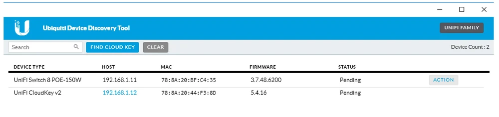 Primero ejecutamos la Herramienta de Descubrimiento para ver qué direcciones ha recibido cada dispositivo y encontrar nuestro Unifi Cloud Key.