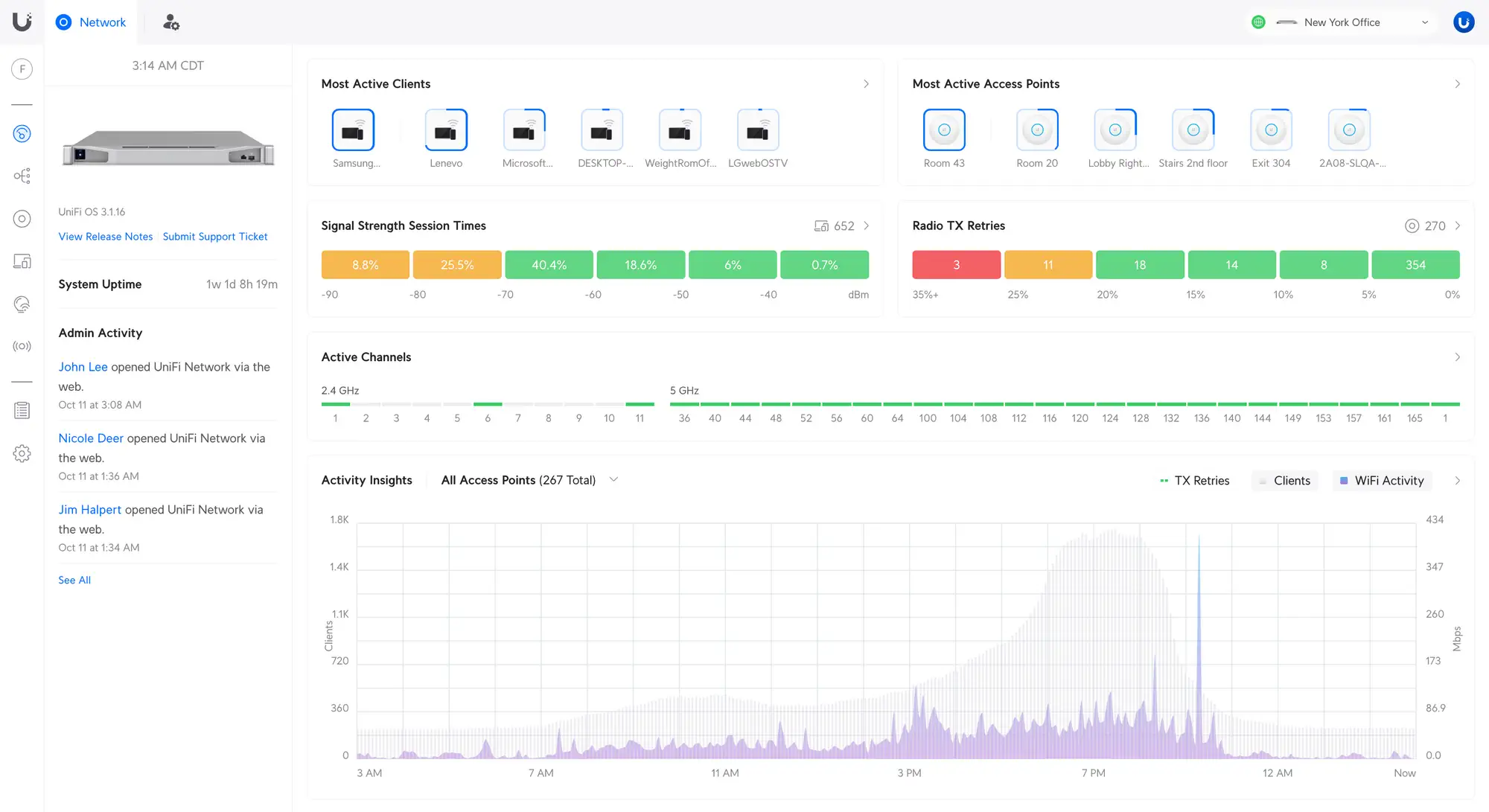 Además de las correcciones, la actualización UniFi Network Application 7.5.187 ha introducido cambios gráficos que facilitan tanto a los administradores de red como a los usuarios finales el seguimiento del rendimiento de la red inalámbrica. Los principales cambios gráficos se han realizado en el panel de control, donde widgets como: