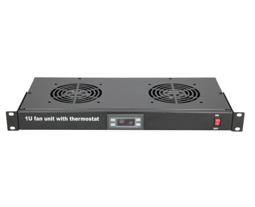 El panel de ventilación incluye 2 ventiladores, sensor de temperatura con cable de 1,8 m, cable de alimentación de 1,7 m, pantalla digital de la temperatura actual. El producto presentado está diseñado para recintos de 19". El panel frontal tiene una pantalla de termostato y botones para ajustar la temperatura.