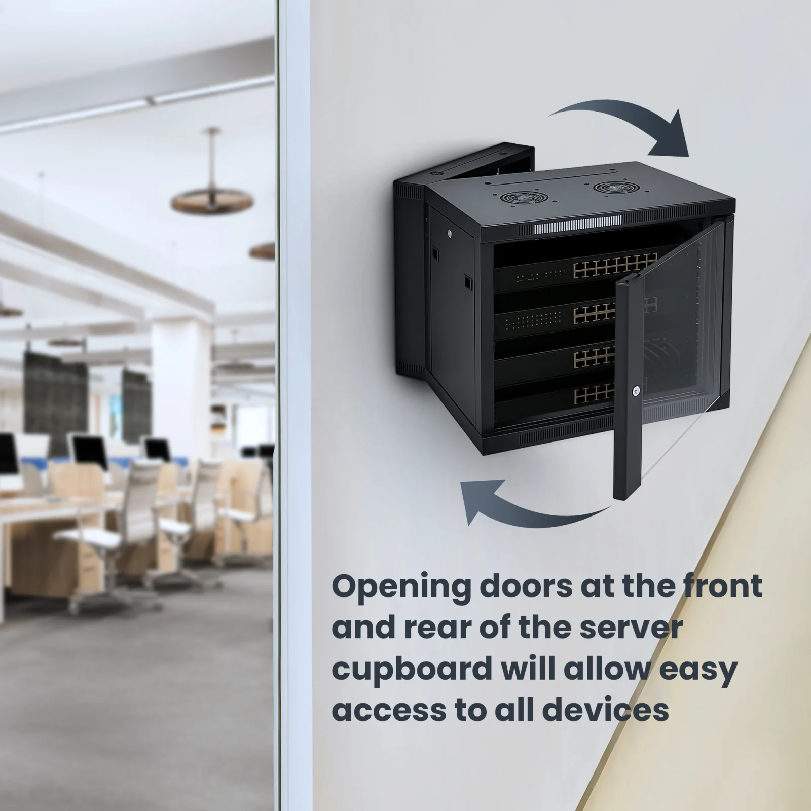 El gabinete Extralink está diseñado para el montaje en la pared en oficinas, salas de servidores de red y salas de control de instalaciones de CCTV. Las paredes exteriores son de chapa de acero laminado en frío, mientras que la puerta de entrada tiene un cristal templado que puede abrirse a la izquierda o a la derecha. La construcción de dos secciones facilita el acceso a los componentes instalados desde atrás.
