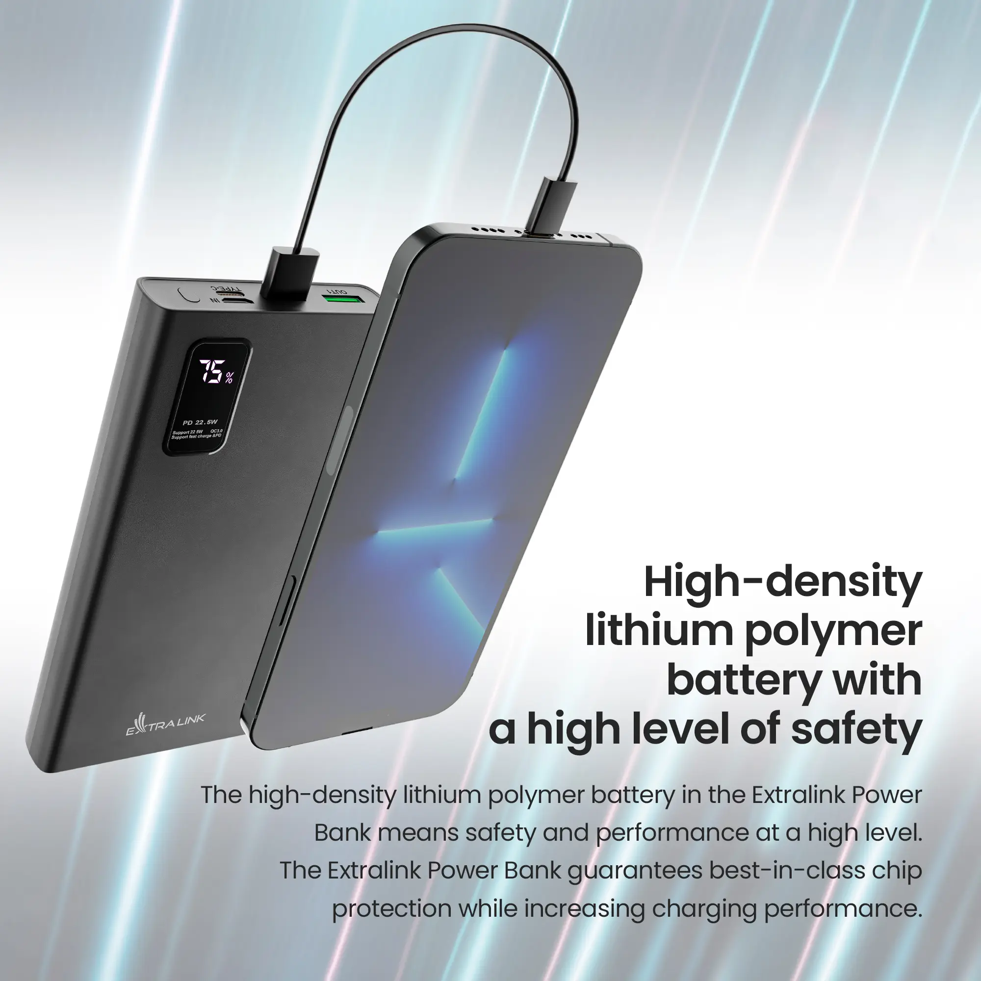 La batería de polímero de litio de alta densidad del Extralink Power Bank es sinónimo de seguridad y rendimiento de alto nivel. El Extralink Power Bank garantiza la mejor protección de chip de su clase, al tiempo que aumenta el rendimiento de la carga.