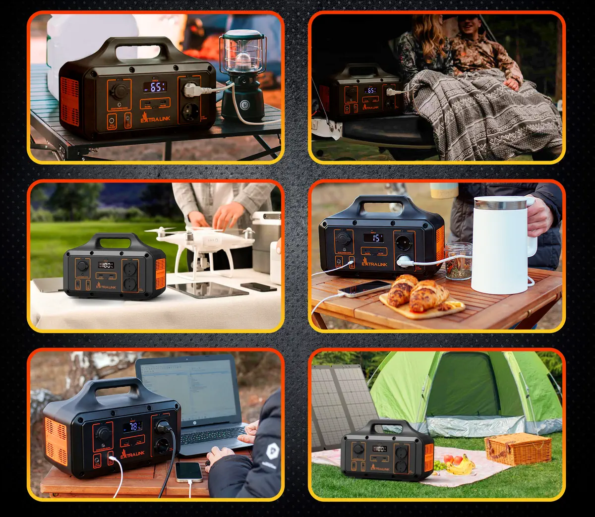 Con alta potencia y 1021Wh de capacidad, el Extralink EPS-S1000S cuenta con 2 tomas de corriente alterna, una toma de corriente continua, 2 puertos USB y 1 puerto USB Tipo C PD 100W. Alimentará su nevera de excursión, su televisor, su mini nevera, su parrilla eléctrica, su ventilador y muchas otras necesidades de exterior e interior.