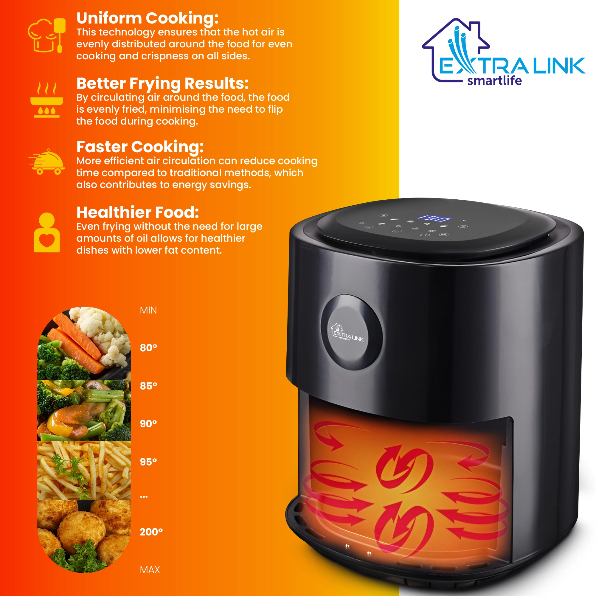 Extralink Smart Life SJ-400 es una innovadora freidora de aire caliente sin grasa que te permite preparar alimentos sanos y crujientes sin añadir grasa. Con una app específica, puedes controlar cómodamente la temperatura y el tiempo de cocción, lo que te da un control total sobre el proceso de cocción. Es ideal para familias que se preocupan por su salud sin renunciar al sabor de sus platos favoritos.