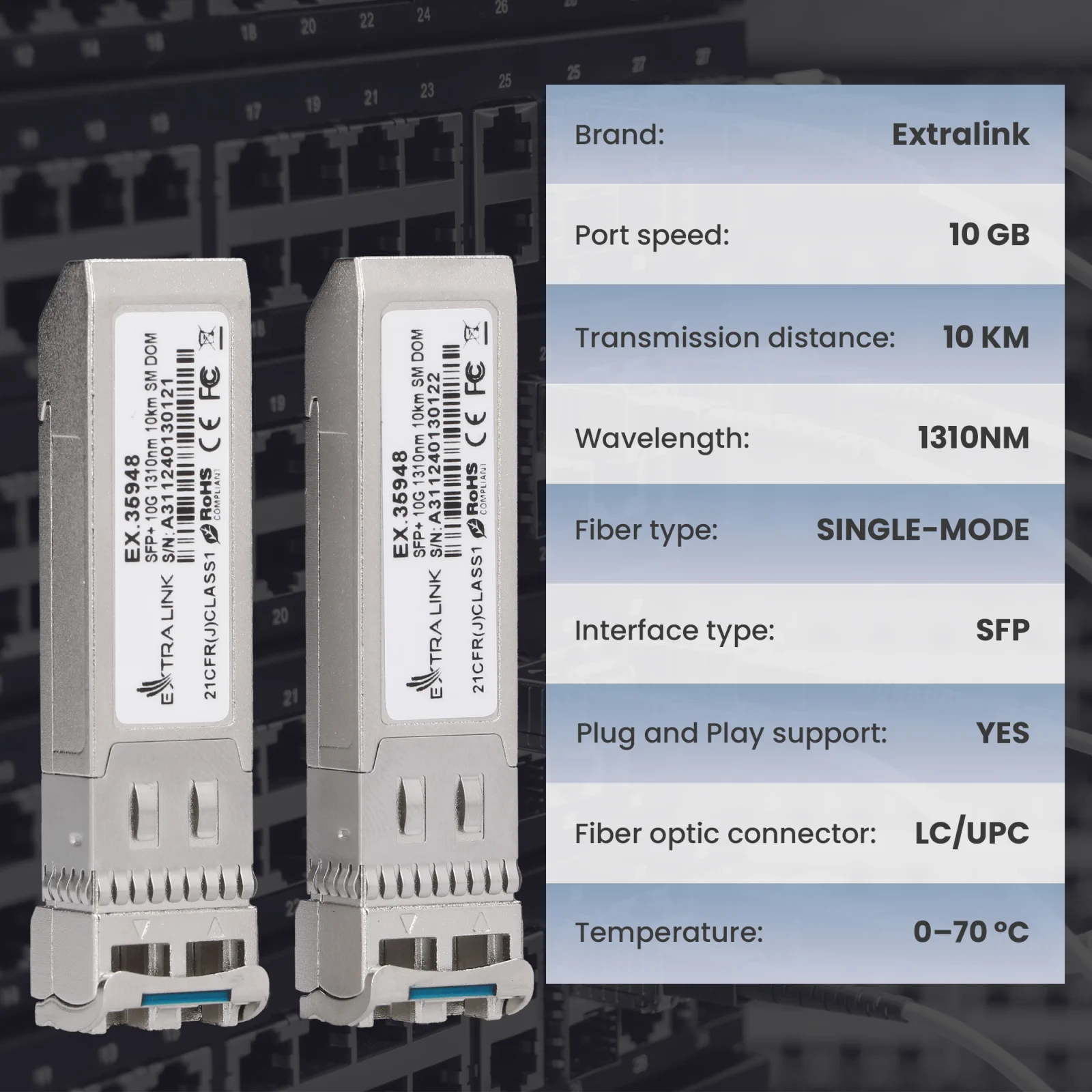 Extralink SFP+ 10G 1310nm 2-pack | SFP+ Módulo | Single mode, LC, 10km, dedicado para HP/ARUBA