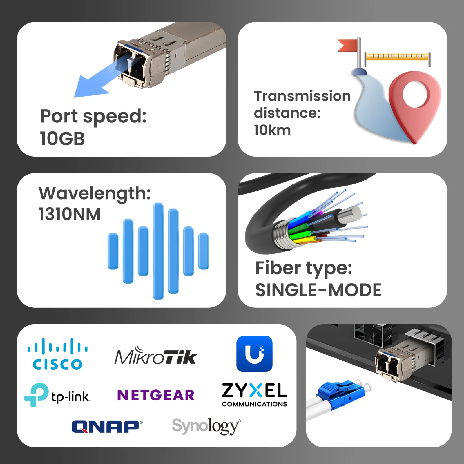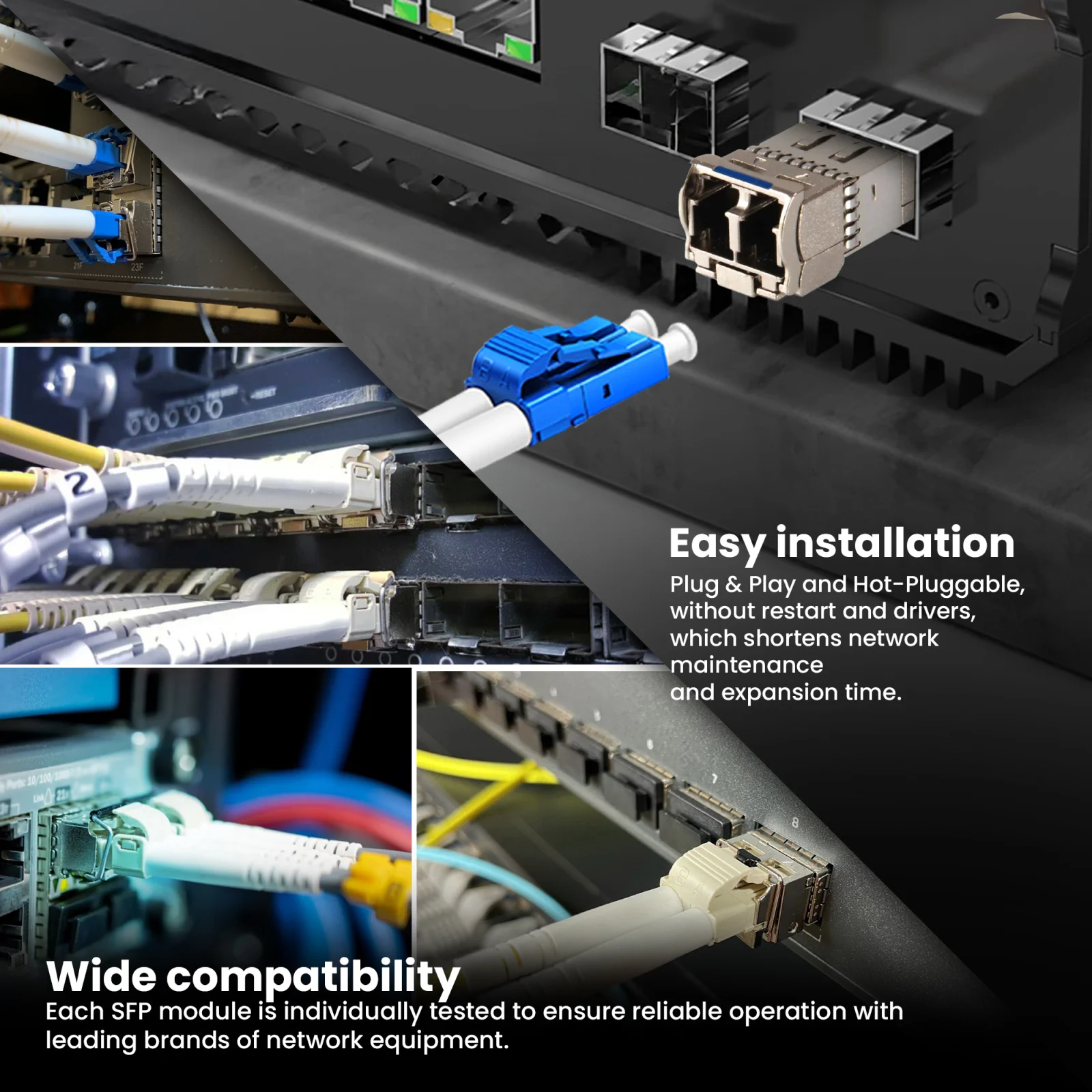 El cartucho monomodo permite la transmisión a distancias de hasta 10 kilómetros, lo que lo hace adecuado para aplicaciones de red de área local y amplia. Su bajo consumo se traduce en un menor consumo de energía, lo que resulta beneficioso desde el punto de vista de los costes operativos y el medio ambiente.