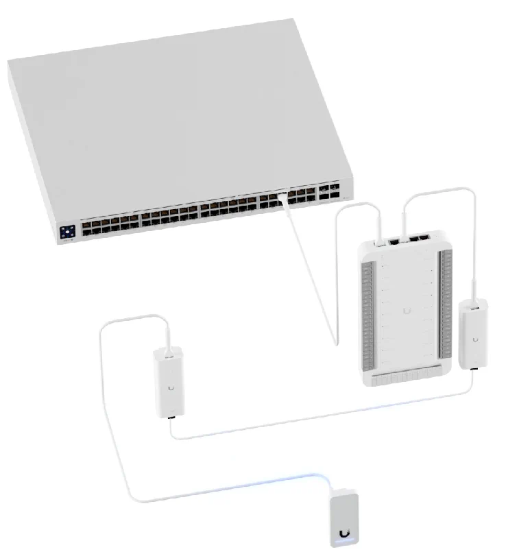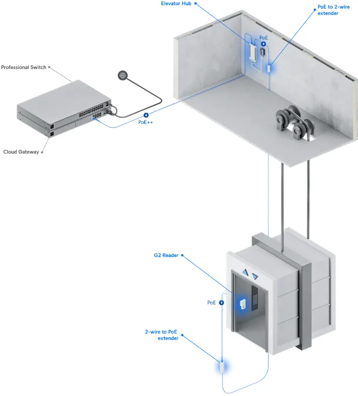 Kit de Inicio Ubiquiti UA-SK-Elevator, UniFi Access, Elevator Hub, Lector G2, 2x Extensor PoE de 2 Hilos, 10x Tarjeta de Acceso