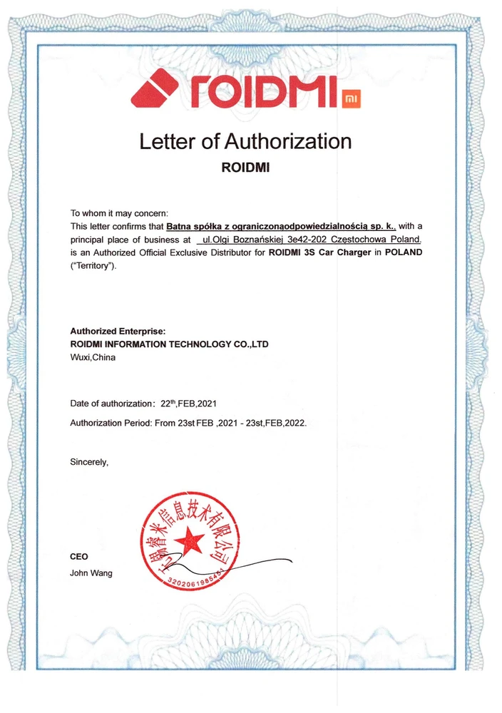 Below is the official document, which confirms the exclusive distribution of Roidmi 3S Car Chargers for BATNA Sp. z o.o Sp. k