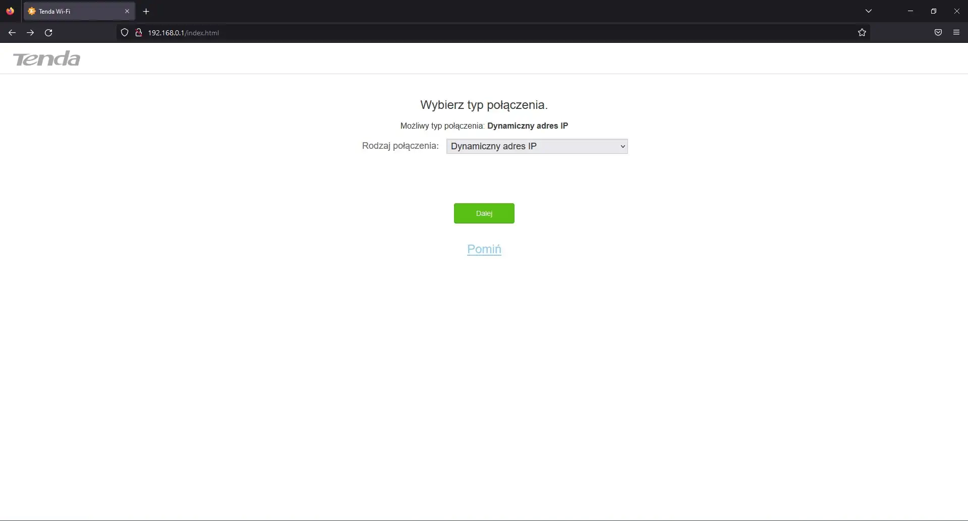 When the device first starts up, it greets us with a welcome screen. The next thing the router asks us to do is to select the type of Internet connection, if you don't know what type you have, you can simply skip this point. The next step is to give us a name for the Wi-Fi network and to set a password for it and for logging into the router's settings. These fields can be left blank, but this is by no means recommended!
