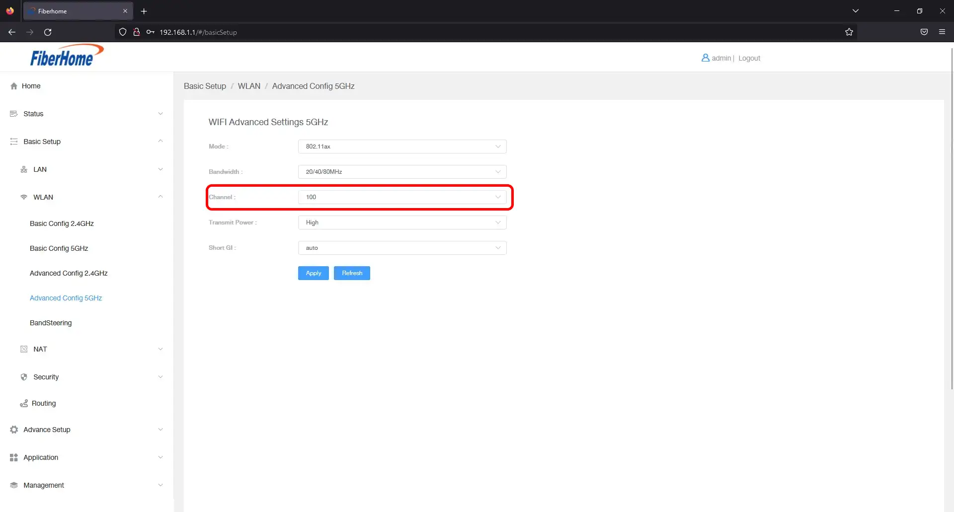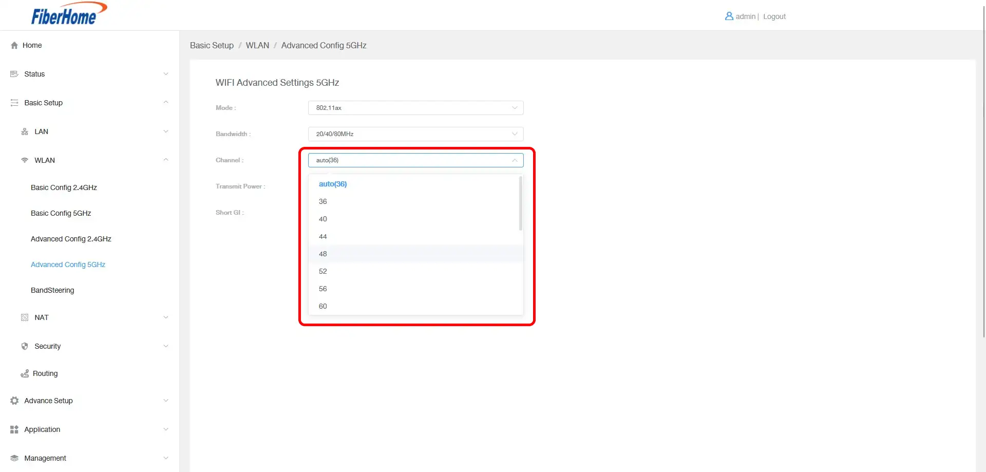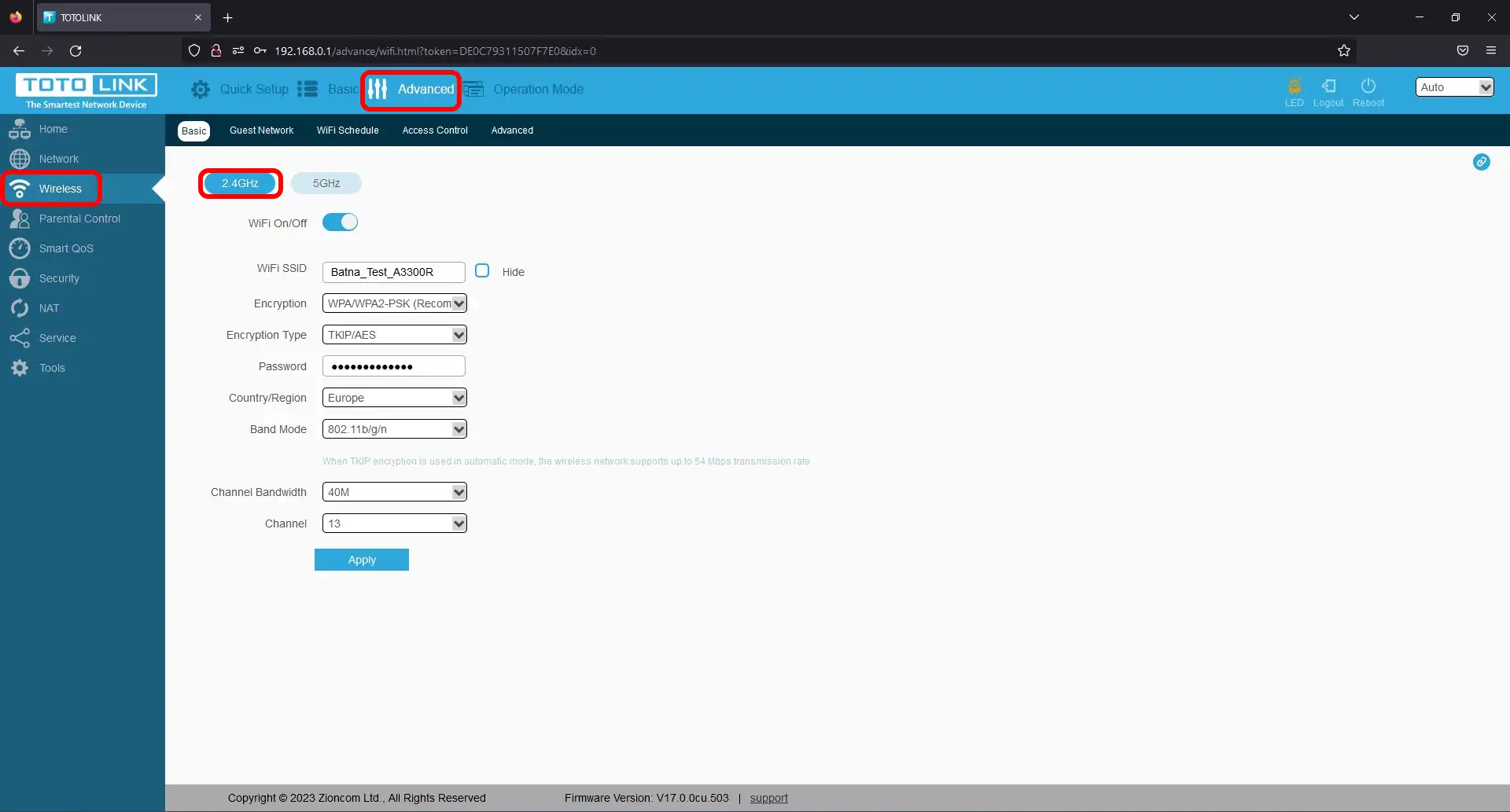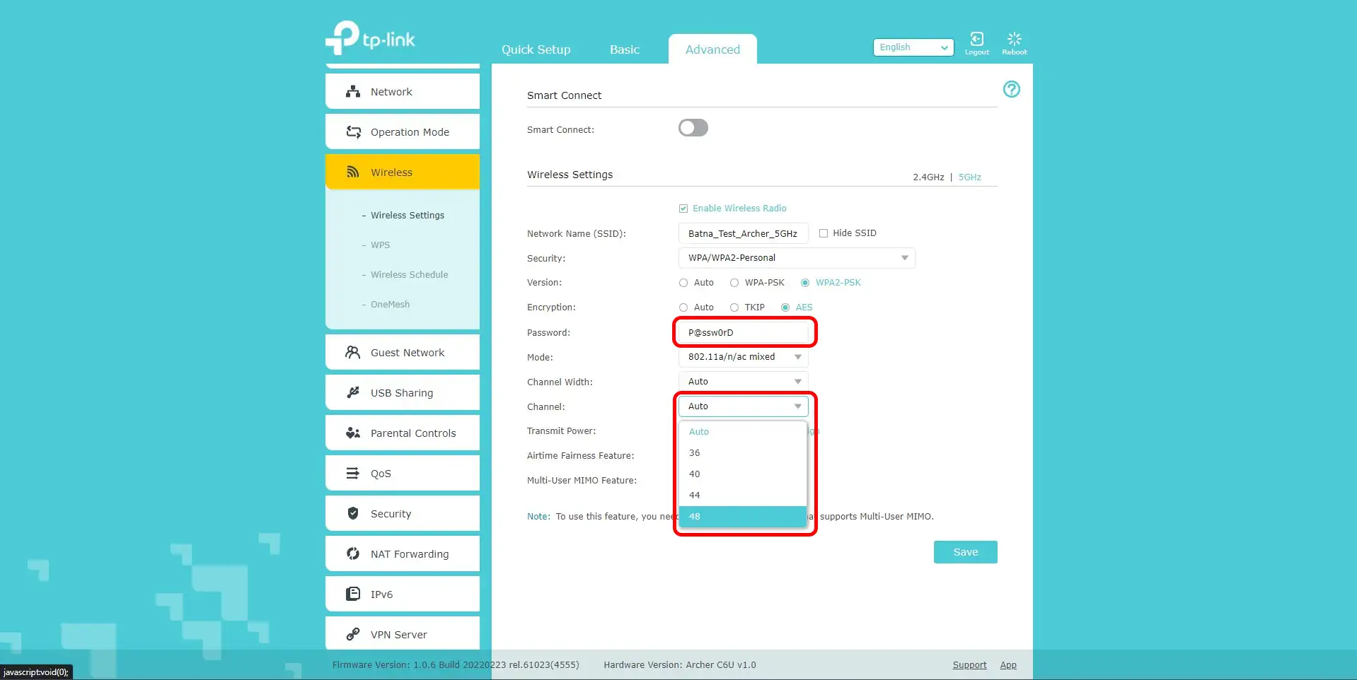 To set up a Wi-Fi network, go to the Advanced tab, select Wireless, and set a strong password and select more free channels. For 2.4GHz it is channel 13, and for 5GHz it is channel 48.