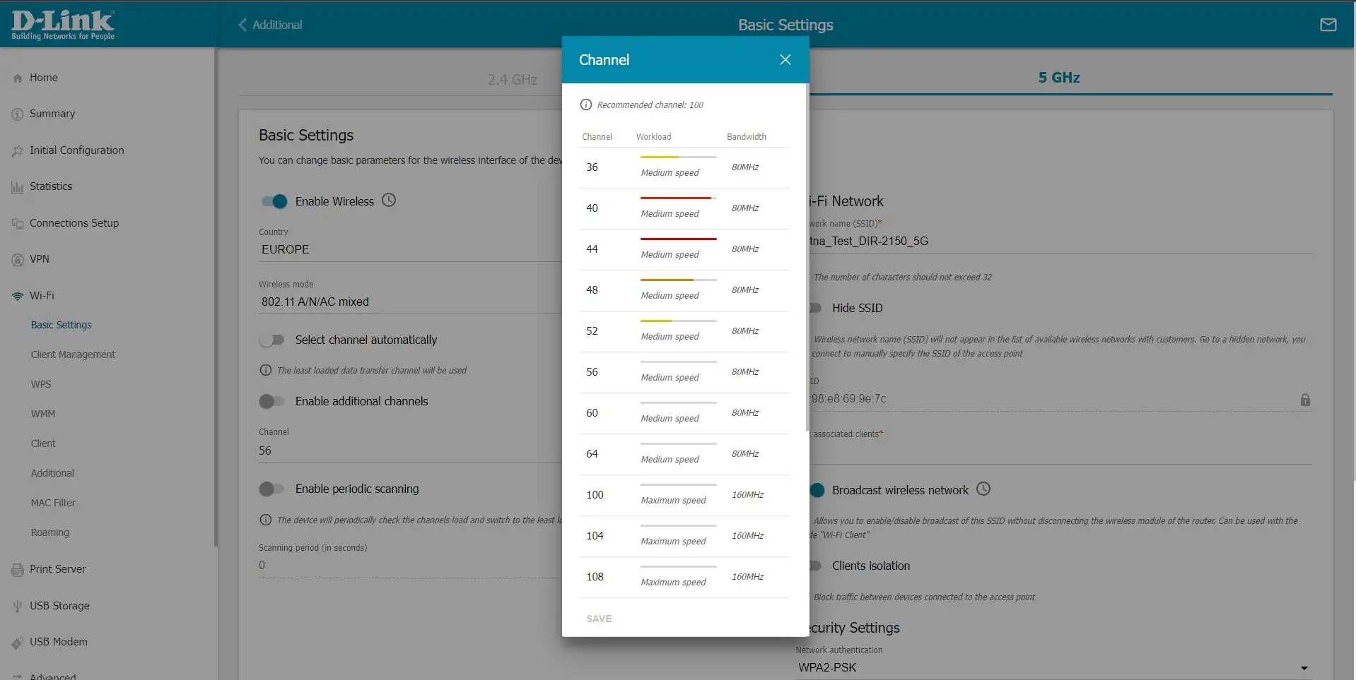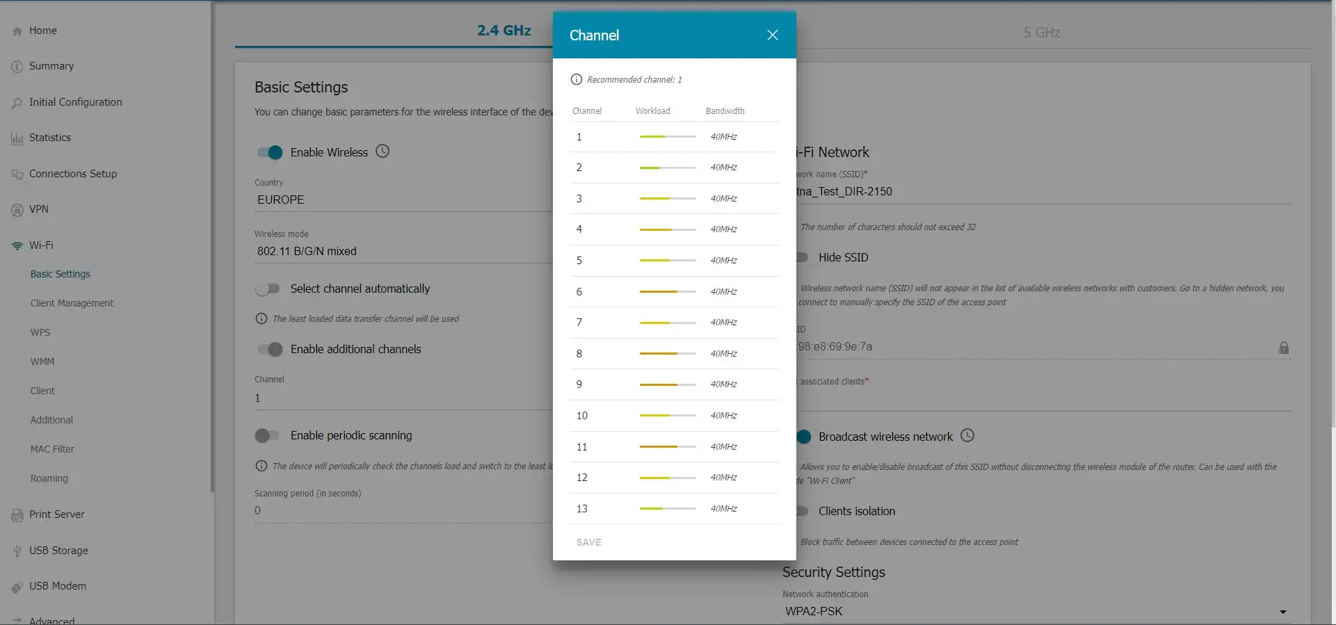 As we've written before, D-Link has been in the network equipment market for a long time, and this is evident in the number of settings and their usefulness. So, to change the channel of Wi-Fi usage, go to the Wi-Fi tab and turn off the"Select channel automatically" parameter on the 2.4 GHz network, then click select channel. At this point, the router will not only ask you which channel you want to use, but it will also show you which channels are most loaded. Depending on the available channels, choose the least busy one. You can do the same with the 5 Ghz frequency.