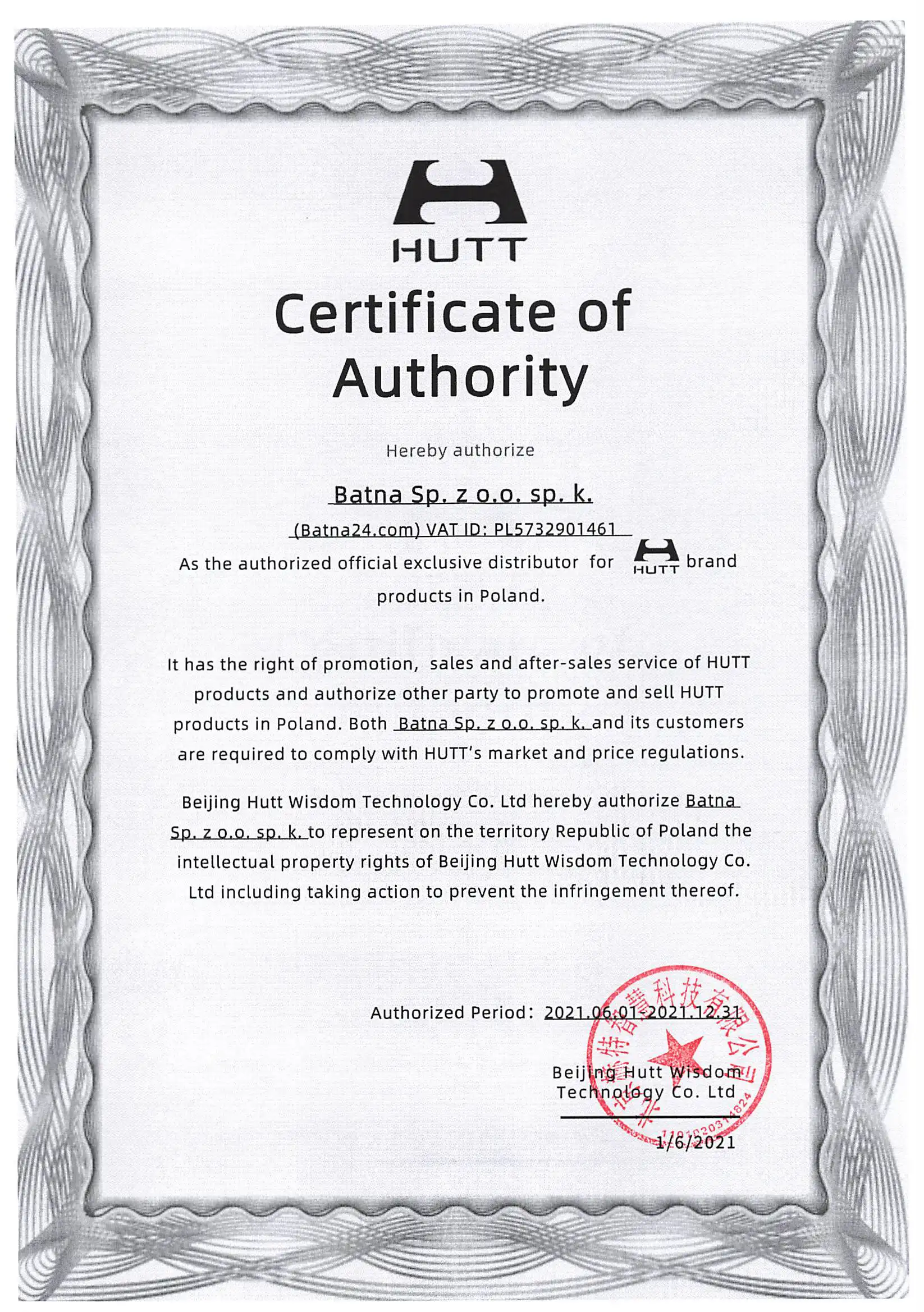 Beijing Hutt Wisdom Technology Co. Ltd hereby authorizes Batna Sp. z o.o. sp. k. to represent in the territory of the Republic of Poland the intellectual property rights of Beijing Hutt Wisdom Technology Co. Ltd, including taking actions to prevent their infringement.