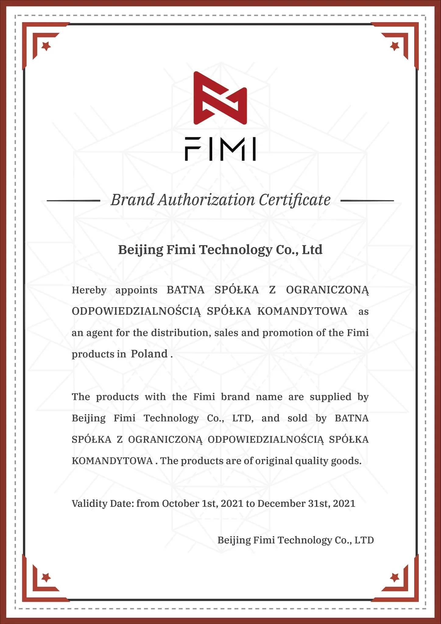 We would like to inform you that as of October 1, 2021. Batna Sp. z o.o. Sp. k. with its registered office in 42-202 Czestochowa, 3e Olgi Boznanska Street, has become an OFFICIAL DISTRIBUTOR of FIMI brand products. In connection with the above, Batna Sp. Z o.o. Sp.k. is authorized to officially sell and promote products under the FIMI brand. All products are original high quality products.