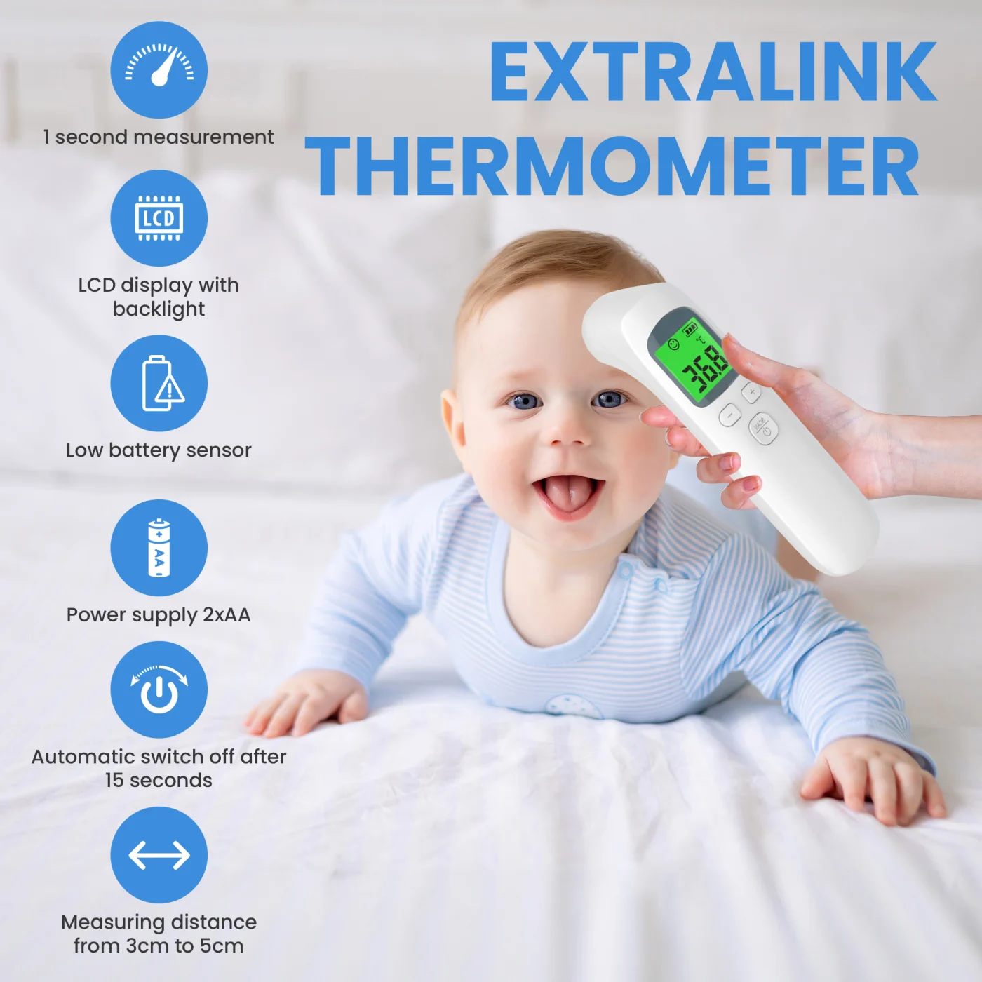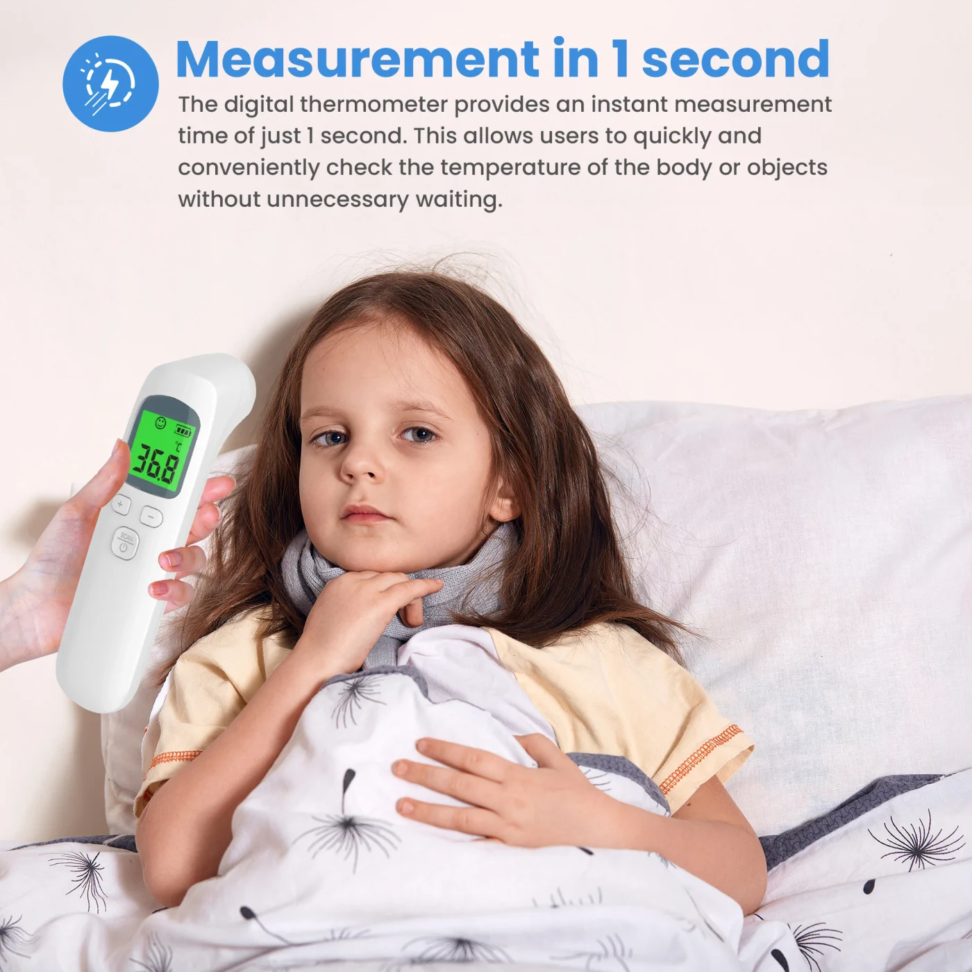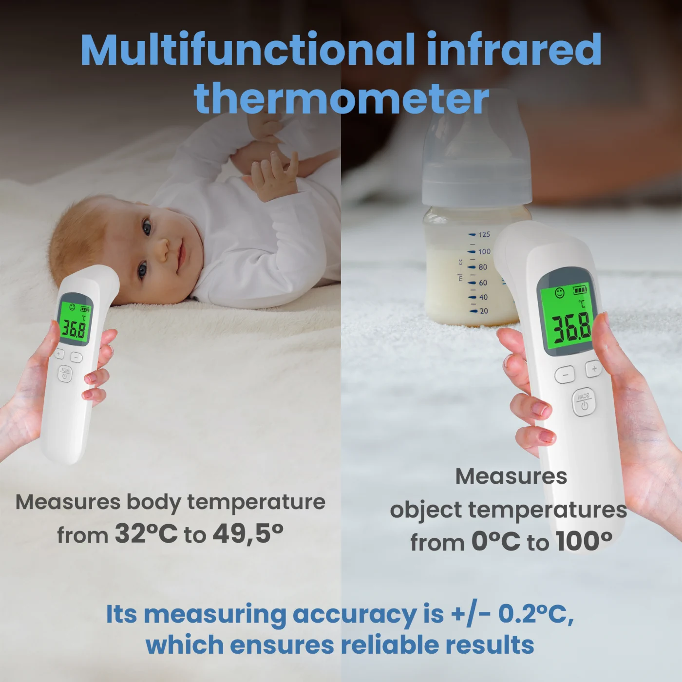 The measurement is fast and efficient, making it a convenient way to get temperature information in a short period of time. This is especially useful for young children or people reluctant to take traditional measurements. Infrared thermometers are characterized by high precision measurements.