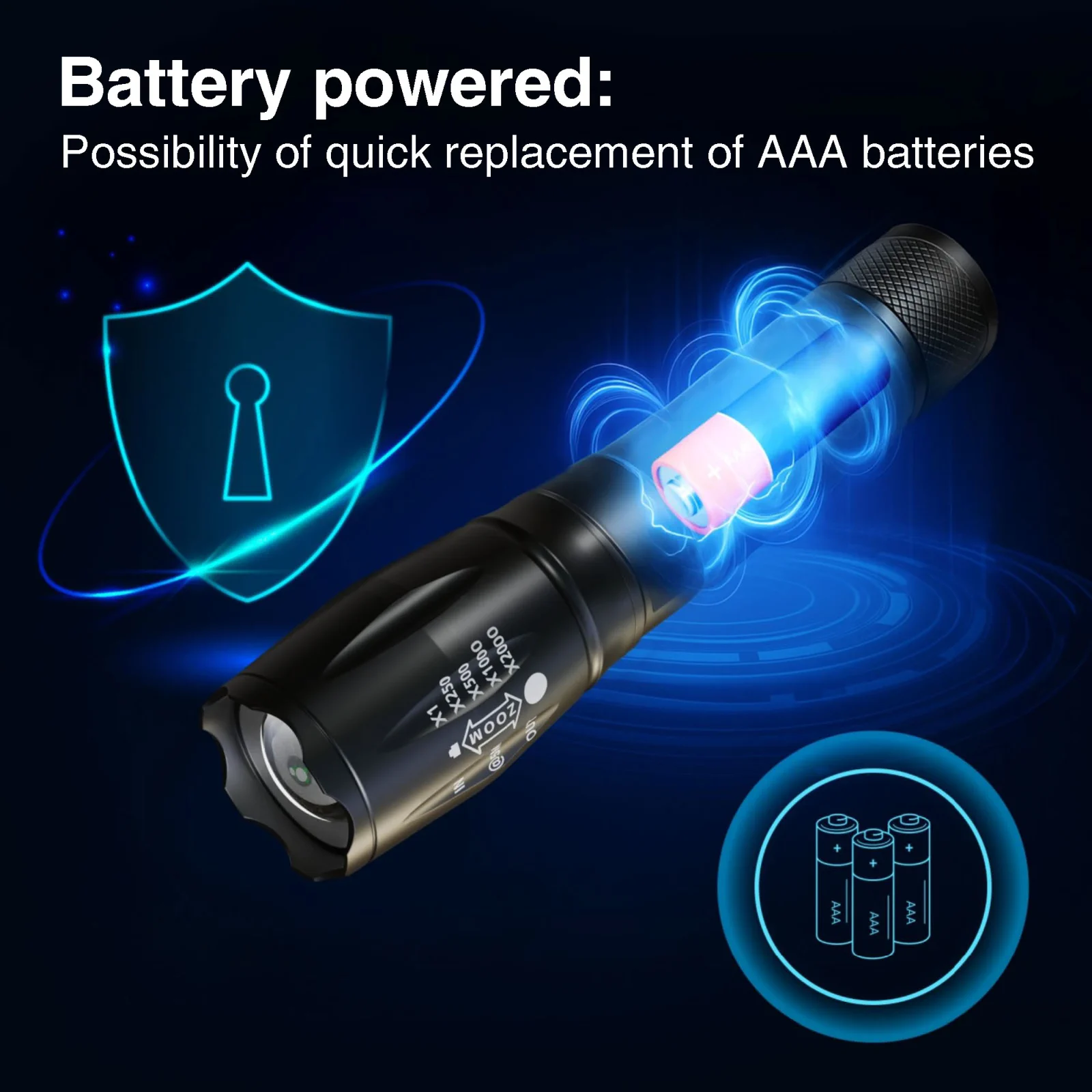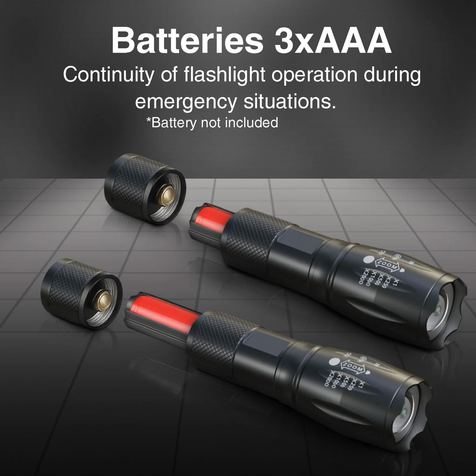 The flashlight uses3AAA batteries for power, which can be easily replaced.
