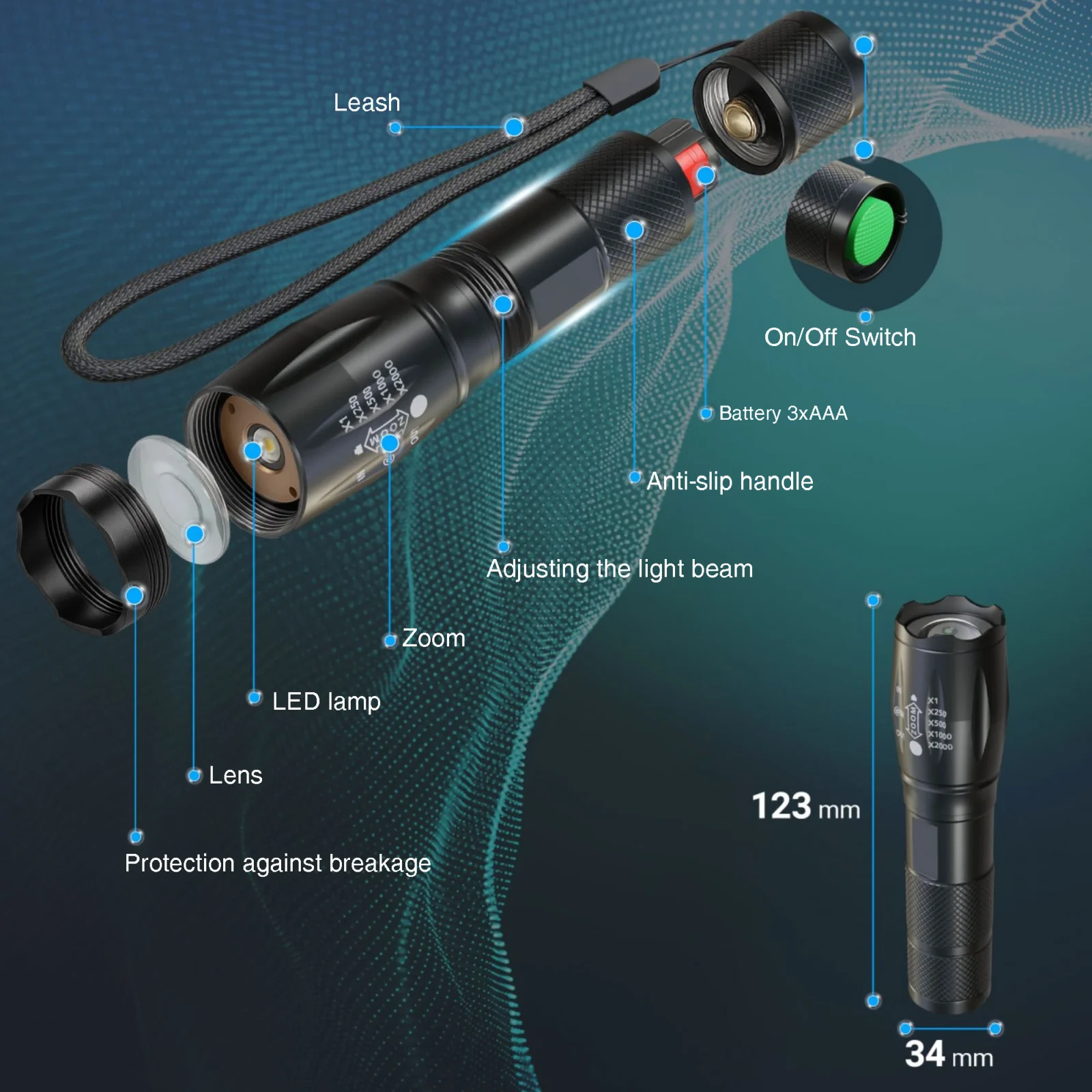 The mini flashlight has several useful lighting modes: strong / medium / low light / flash / sauce mode. the flashlight is equipped with a beam focus adjustment.