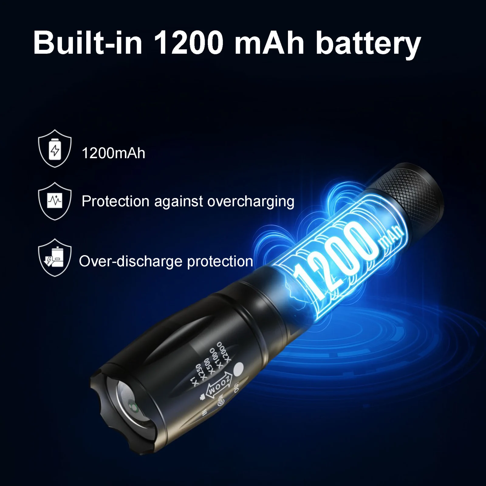 The flashlight uses a rechargeable lithium battery, which can be recharged multiple times if discharged.
