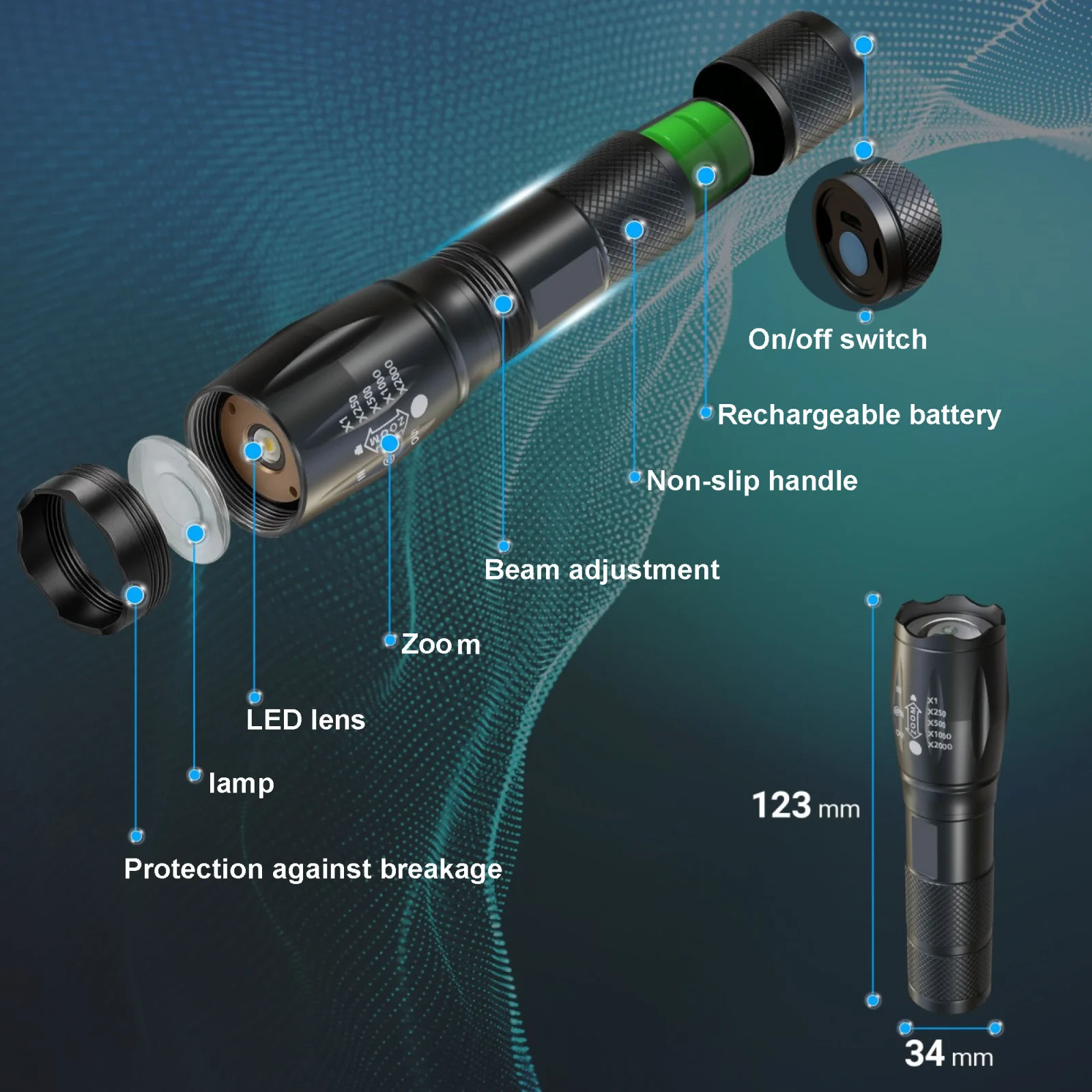 The mini flashlight has several useful lighting modes: strong / medium / low light / flash / sauce mode. the flashlight is equipped with a beam focus adjustment.