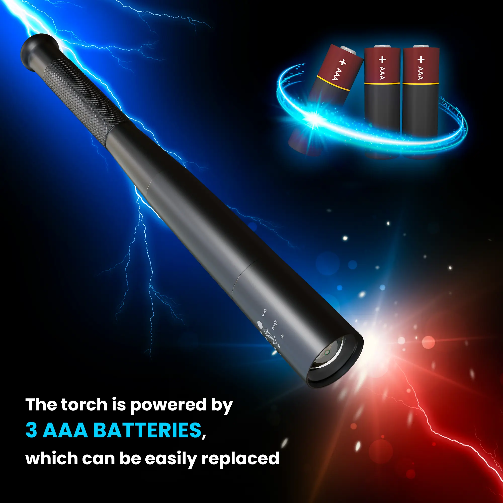 The flashlight uses three AA batteries for power, which can be easily replaced.