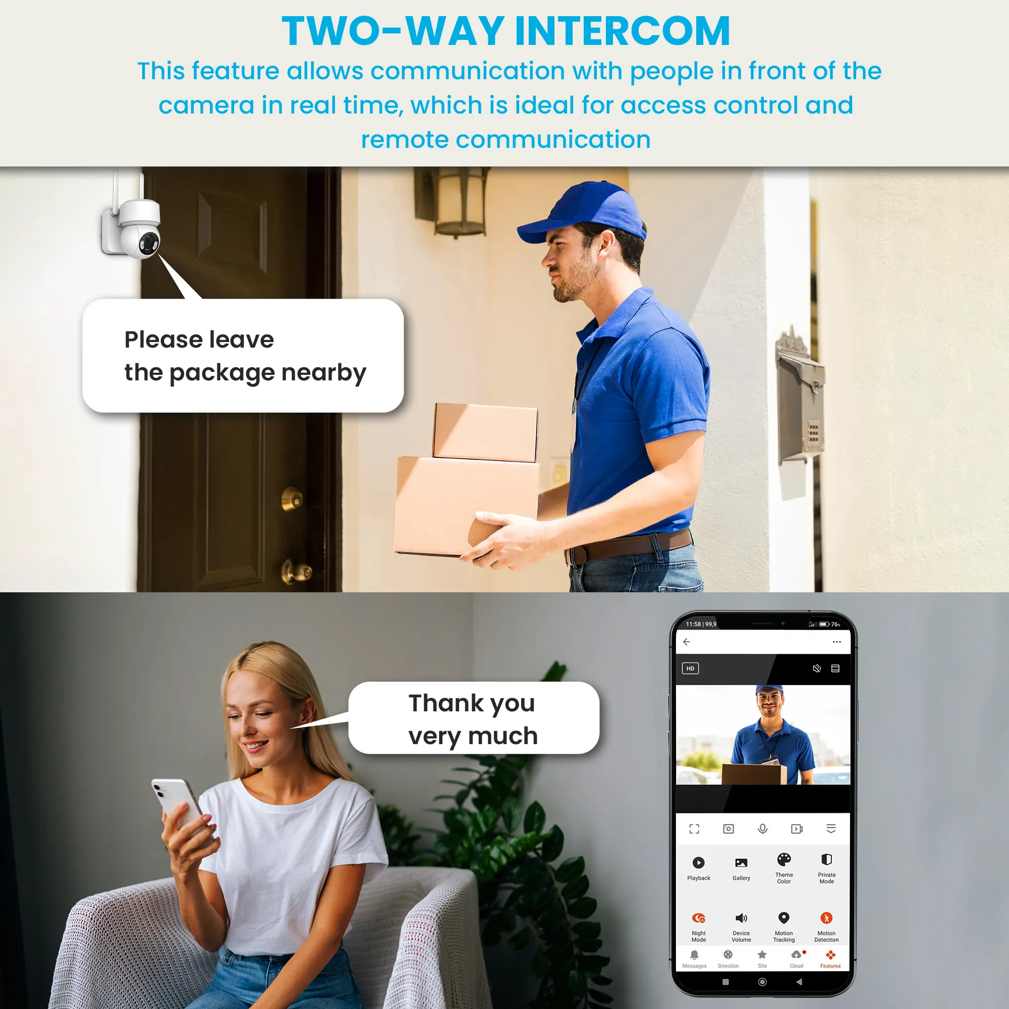 - Two-way intercom: This feature allows you to communicate with people in front of the camera in real time, which is ideal for access control and long-distance communication