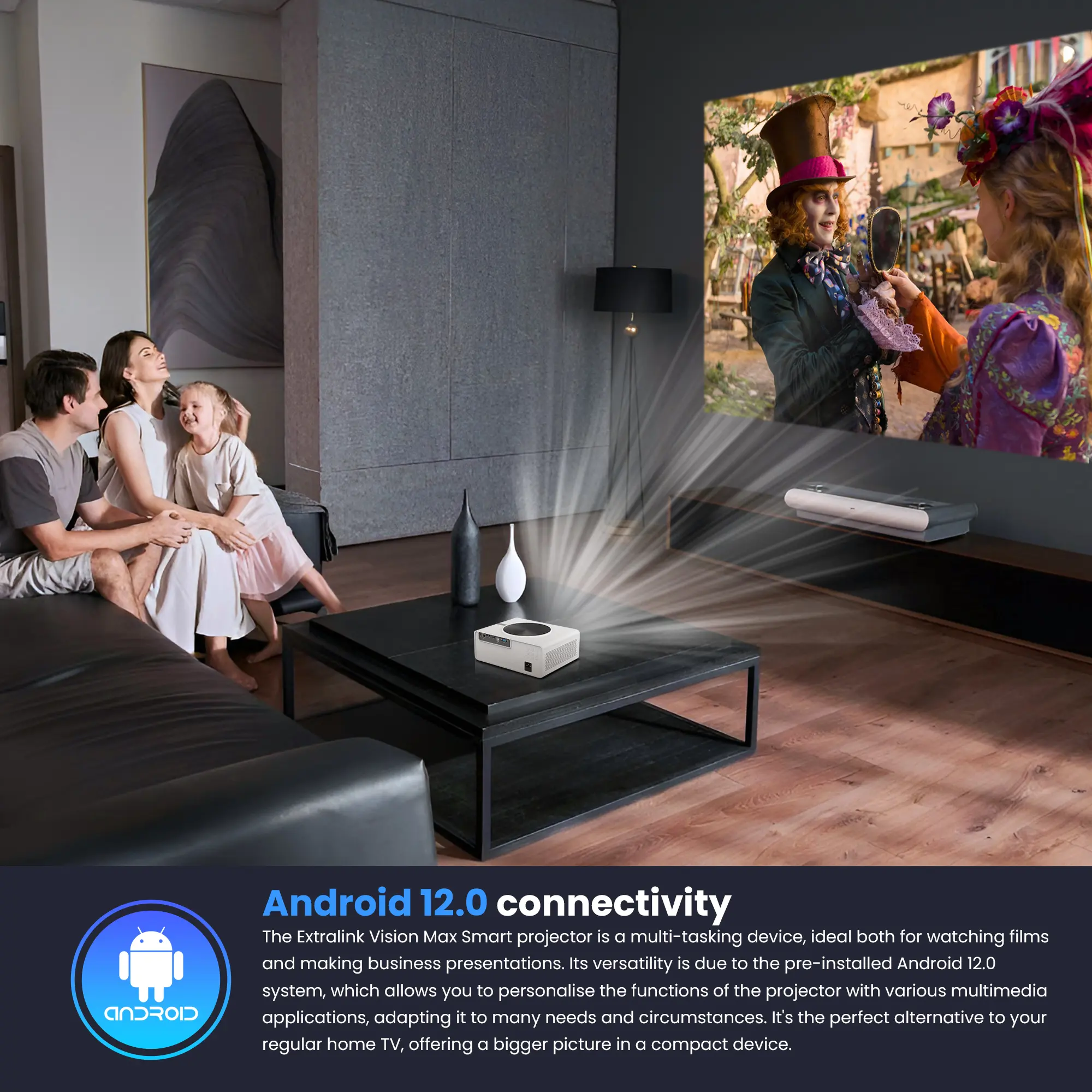 The Extralink Vision Max Smart projector is a multi-tasking device, ideal for both watching movies and giving business presentations. Its versatility stems from the pre-installed Android 12.0 system, which allows you to personalize the projector's functions with various multimedia applications, customizing it for a wide range of needs and circumstances. It is an excellent alternative to regular home TVs, offering a larger image while remaining compact.