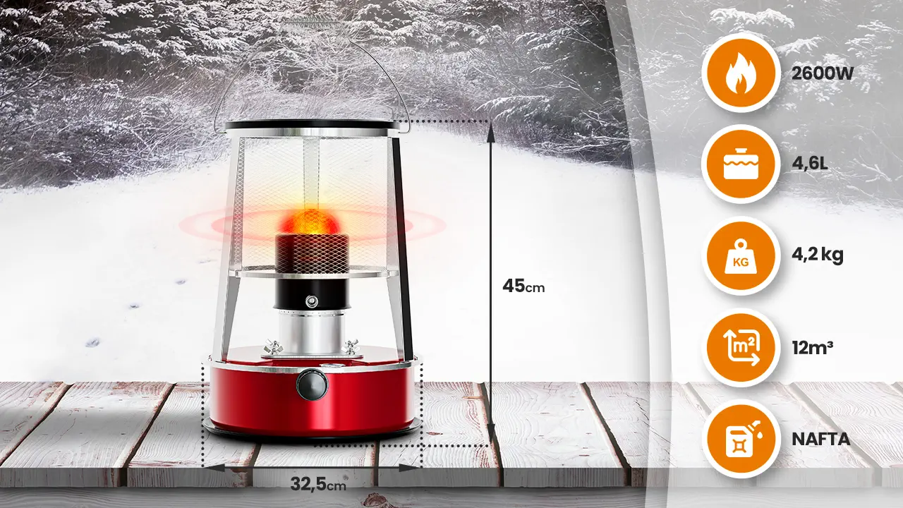 Extralink Aladdin portable kerosene heater with high efficiency creates a comfortable and warm environment around you. The Aladdin heater will be ideal to help you solve problems related to the lack of electric heating or as a heat source during the winter. It will also warm you while camping and allow you to boil water making it easier to prepare a warm drink or meal.