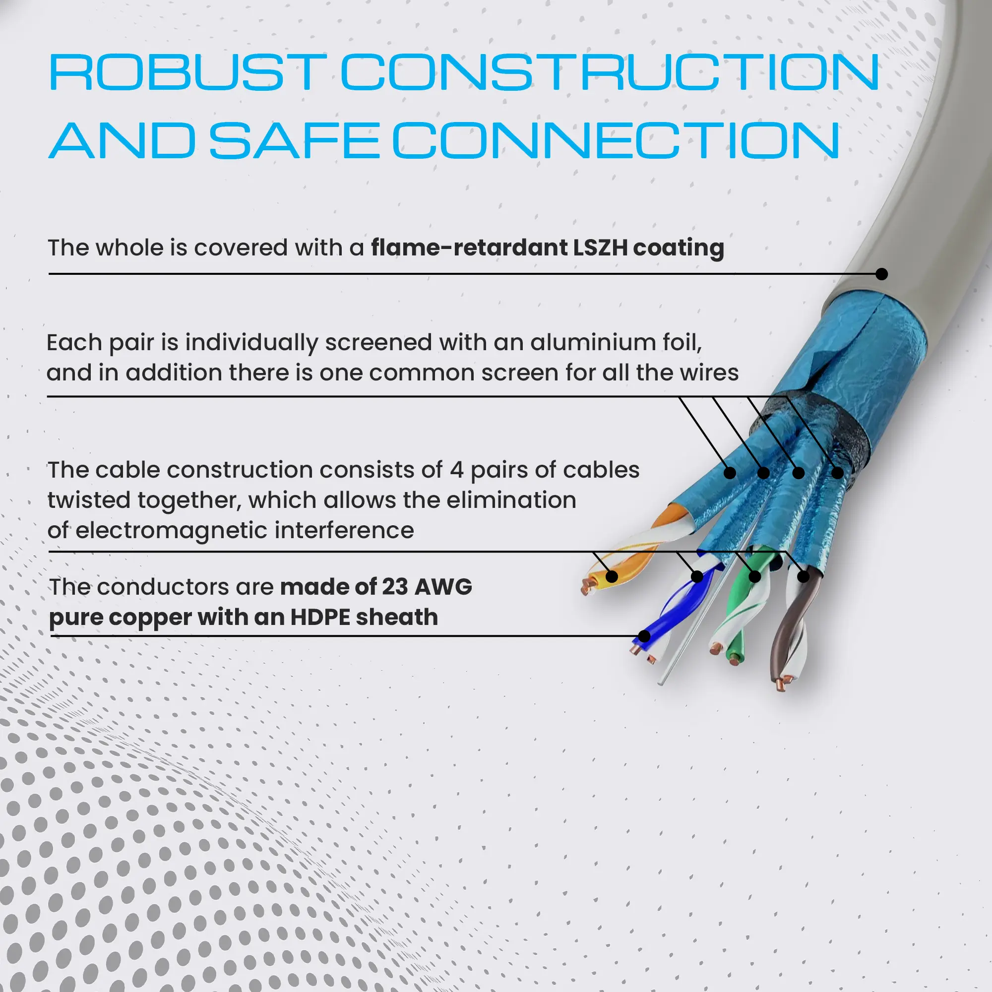Extralink Cat. 6A FTP è un cavo di rete di alta qualità per l'installazione in interni. La categoria 6a comprende il cablaggio che richiede una banda di 500 MHz e la trasmissione dati fino a 10 Gb/s (10 Gigabit Ethernet). La costruzione del cavo è costituita da 4 coppie di cavi intrecciati tra loro per eliminare le interferenze elettromagnetiche. I cavi sono realizzati in rame puro con uno spessore di 23 AWG con guaina HDPE. Ogni coppia è schermata separatamente con un foglio di alluminio e in più una schermatura comune per tutti i cavi. Il tutto è rivestito con un rivestimento atossico Low Smoke Zero Halogen (LSZH), in conformità con i requisiti delle norme di sicurezza antincendio per i grandi edifici commerciali.