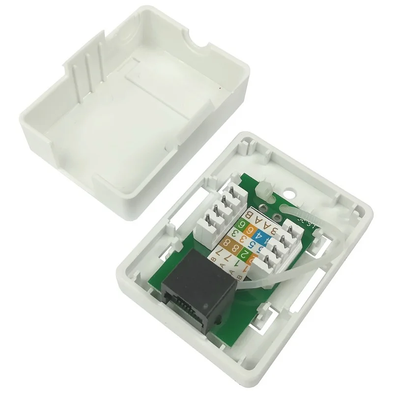 Presa di superficie Cat. 5E di Extralink. Si usa per costruire punti di sottoscrizione in reti di trasmissione dati non schermate conformi a ISO/IEC 11801 e EN 50173 classe D e ANSI/TIA/EIA 568 cat.5E.