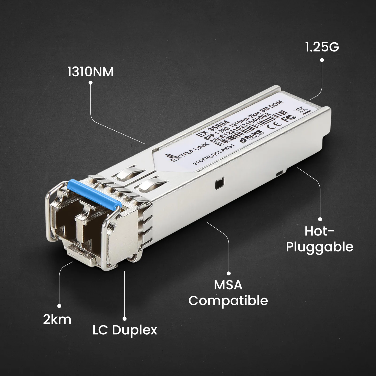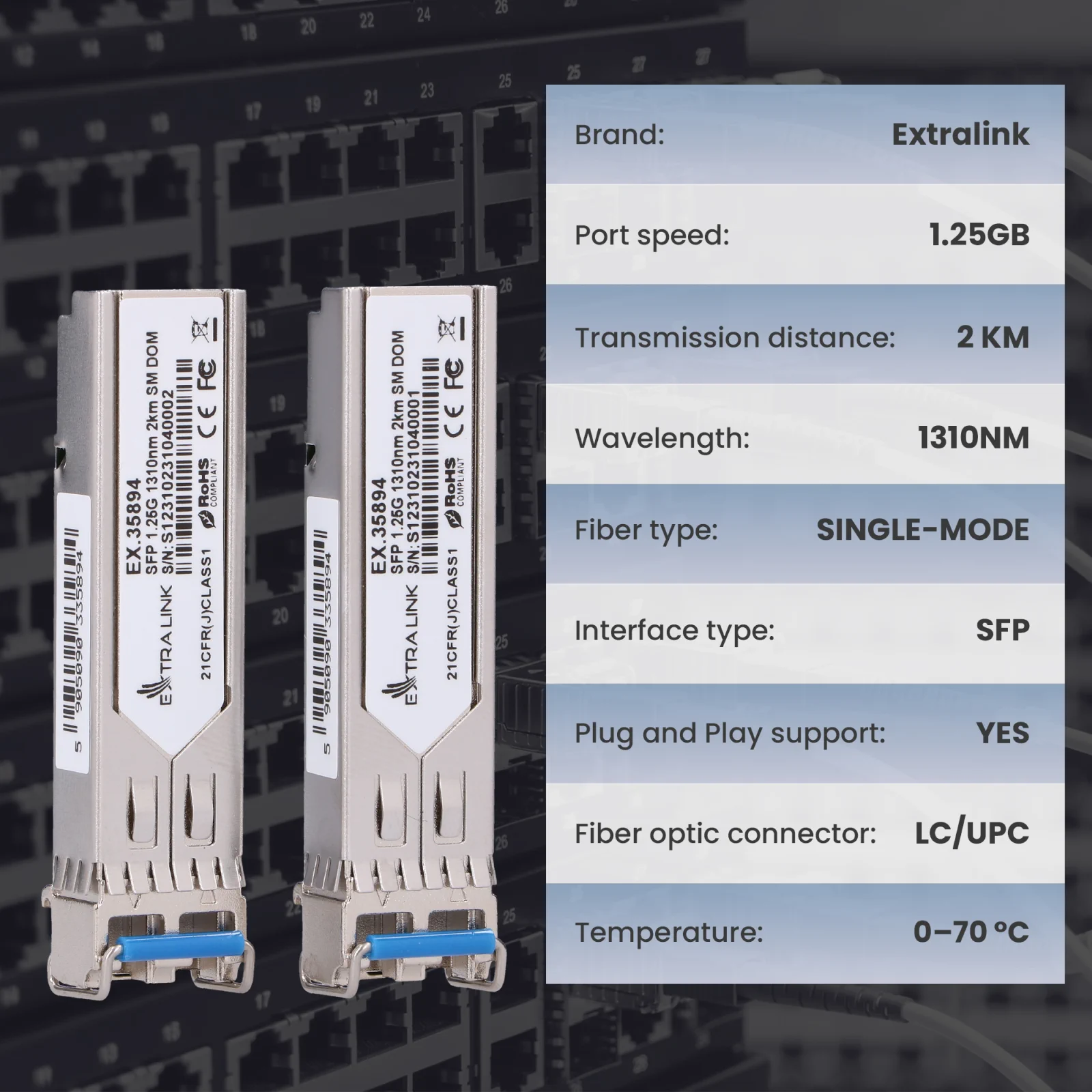 Il modulo SFP di Extralink con specifica 1,25G e velocità di trasmissione dati fino a 1,25 Gbps è dotato di un connettore LC/UPC e di una lunghezza d'onda di 1310 nm che consente una portata di trasmissione fino a 2 km in modalità monomodale, con una funzione DOM che permette di monitorare in tempo reale i parametri operativi come la temperatura, la tensione di alimentazione, la corrente di polarizzazione laser e la potenza ottica trasmessa e ricevuta.