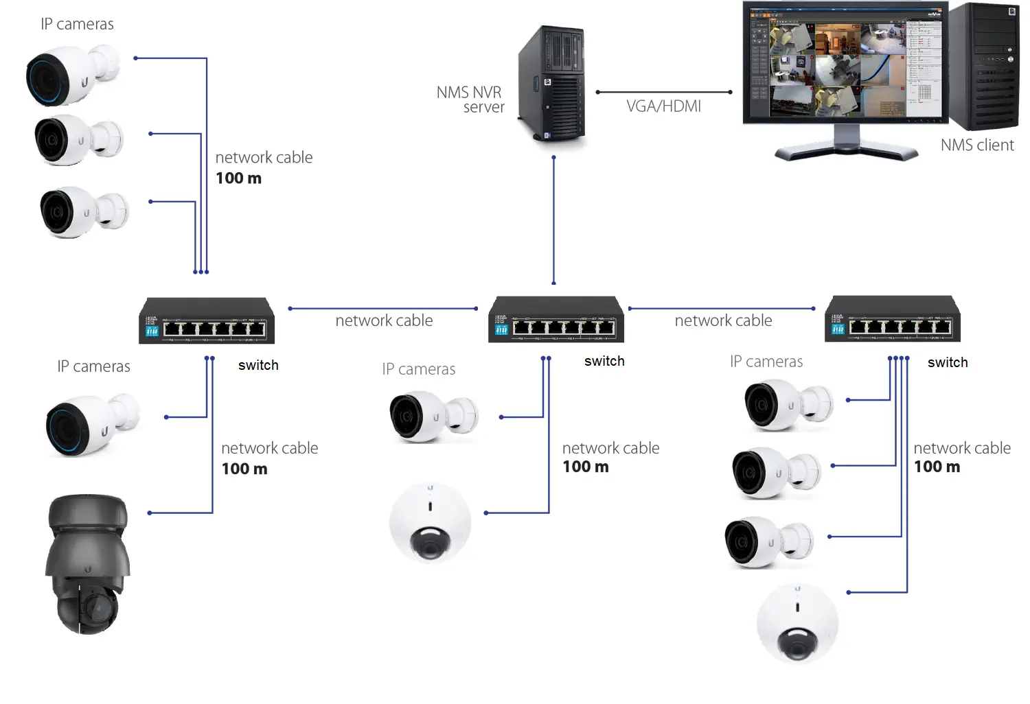 Jak już wcześniej wspomniano switch, czyli przełącznik sieciowy to urządzenie, które umożliwia przekazywanie danych oraz komunikowanie się poszczególnych elementów sieci komputerowej. Jest on również niezwykle potrzebny w przypadku systemów monitoringu IP. Umożliwia on połączenie kamer oraz rejestratora NVR w jedną spójną sieć.