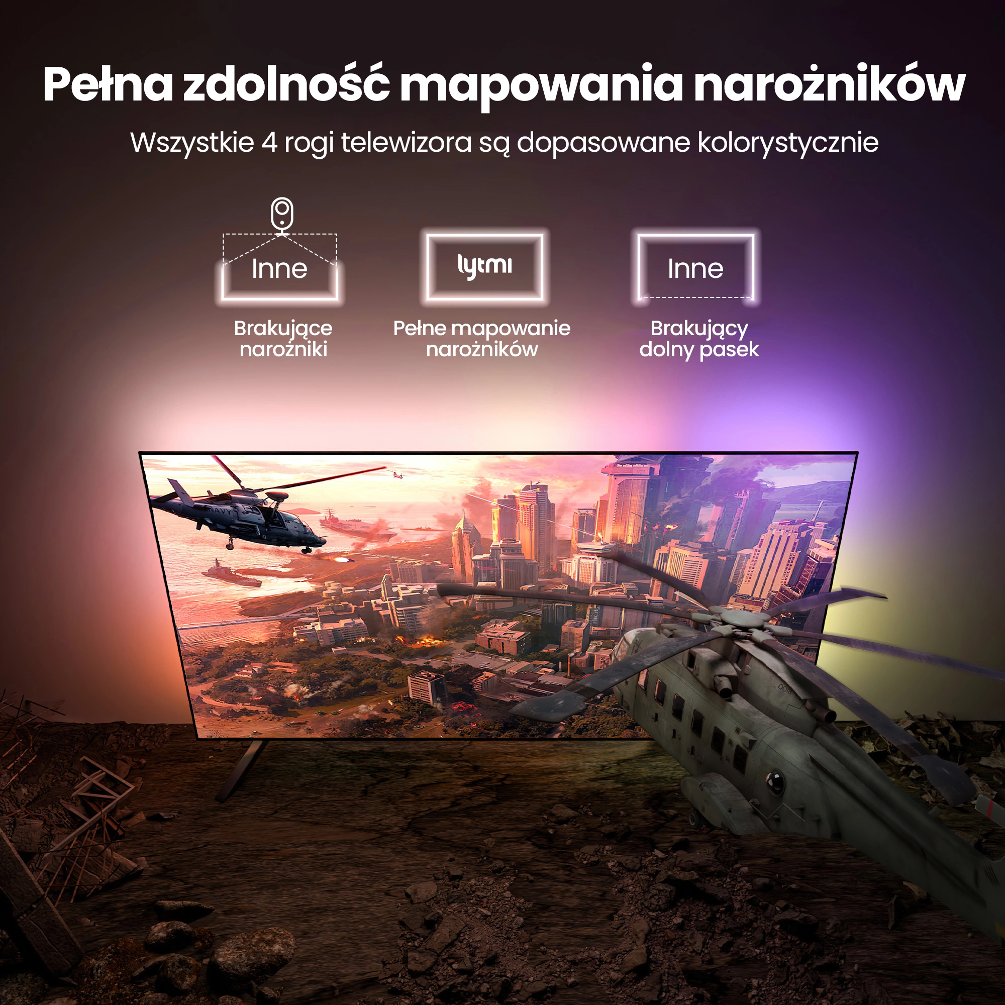 Lytmi Fantasy 3 Pro TV to nowoczesny zestaw oświetlenia LED, który może zmienić sposób oglądania telewizji. Ciesz się niezwykle wciągającą grą światła o wysokiej wydajności z 16,8 milionami kolorów i wysoką częstotliwością odświeżania. Lytmi Fantasy 3 Pro TV zapewnia niesamowite wrażenia wizualne, które przeniosą Cię do świata ulubionych filmów, gier i programów telewizyjnych.
