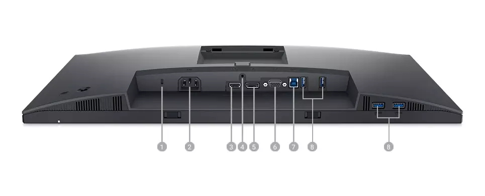 1. Gniazdo blokady | 2. Złącze zasilania | 3. Port HDMI | 4. Blokada podstawy | 5. DisplayPort | 6. Złącze VGA | 7. Superszybki port USB 5 Gb/s typu upstream | 8. Superszybki port USB 5 Gb/s typu downstream