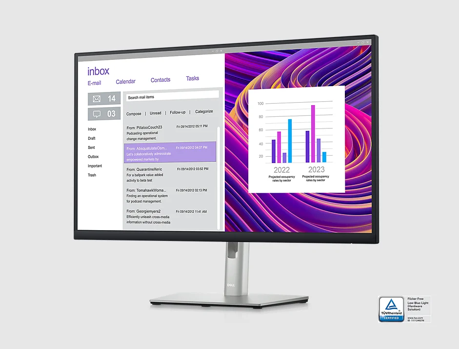 Technologia ComfortView Plus to wbudowana funkcja zmniejszająca emisję niebieskiego światła, która chroni oczy przed jego szkodliwym wpływem. Dzięki temu można pracować przez dłuższy czas bez odczuwania zmęczenia oczu. Dodatkowo technologia IPS zapewnia żywe i jednolite kolory, nawet przy szerokich kątach widzenia, co znacząco poprawia jakość obrazu.